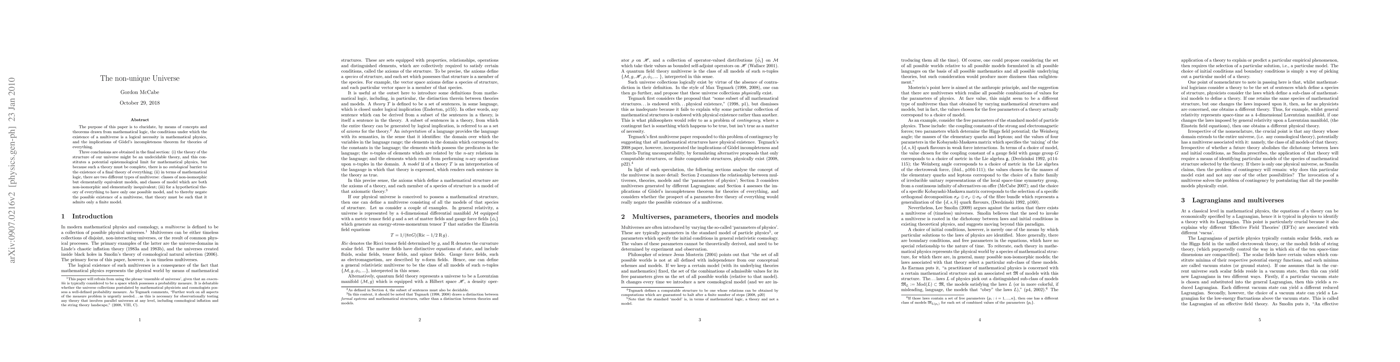 The purpose of this paper is to elucidate, by means of concepts and theorems drawn from mathematical logic, the conditions under which the existence of a multiverse is a logical necessity in mathematical physics, and the implications of Godel's incompleteness theorem for theories of everything. Three conclusions are obtained in the final section: (i) the theory of the structure of our universe might be an undecidable theory, and this constitutes a potential epistemological limit for mathematical physics, but because such a theory must be complete, there is no ontological barrier to the existence of a final theory of everything; (ii) in terms of mathematical logic, there are two different types of multiverse: classes of non-isomorphic but elementarily equivalent models, and classes of model which are both non-isomorphic and elementarily inequivalent; (iii) for a hypothetical theory of everything to have only one possible model, and to thereby negate the possible existence of a multiverse, that theory must be such that it admits only a finite model.
