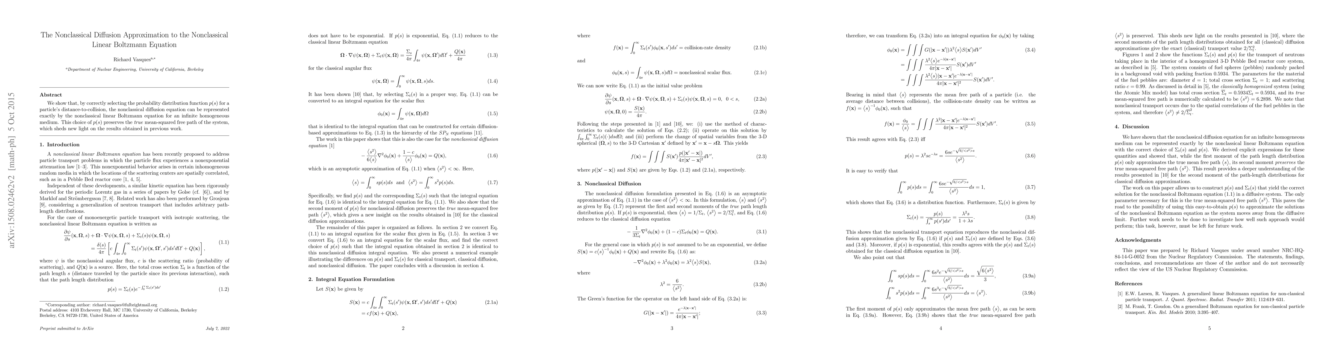 We show that, by correctly selecting the probability distribution function $p(s)$ for a particle's distance-to-collision, the nonclassical diffusion equation can be represented exactly by the nonclassical linear Boltzmann equation for an infinite homogeneous medium. This choice of $p(s)$ preserves the $true$ mean-squared free path of the system, which sheds new light on the results obtained in previous work.