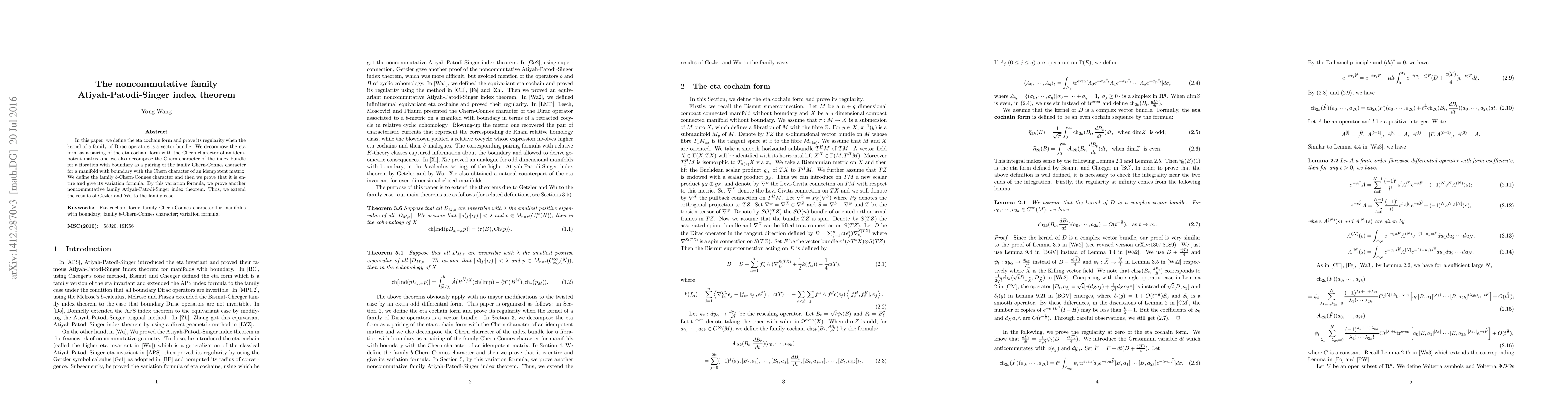 This paper introduces the eta cochain form and proves its regularity for vector bundles over Dirac operator families. It decomposes the eta form and the Chern character of the index bundle, defines the family $b$-Chern-Connes character, and proves a variation formula to establish a noncommutative family Atiyah-Patodi-Singer index theorem, extending previous results.