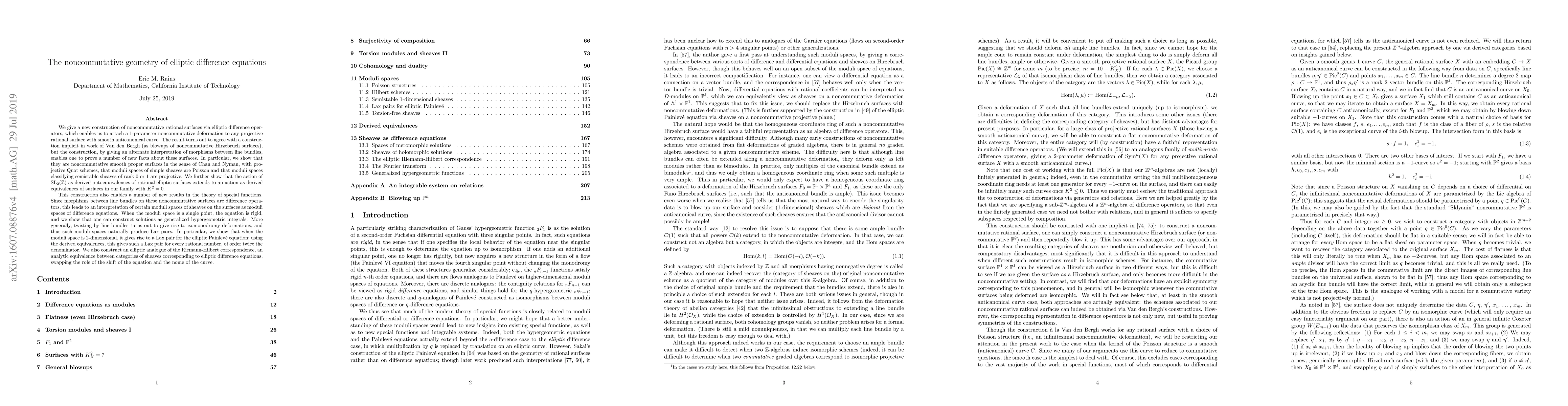 We give a new construction of noncommutative surfaces via elliptic difference operators, attaching a 1-parameter noncommutative deformation to any projective rational surface with smooth anticanonical curve. The construction agrees with one implicit in work of Van den Bergh (iterated blowups of noncommutative Hirzebruch surfaces), but the construction enables one to prove a number of new facts about these surfaces. We show that they are noncommutative smooth proper surfaces in the sense of Chan and Nyman, with projective Quot schemes, that moduli spaces of simple sheaves are Poisson and that moduli spaces classifying semistable sheaves of rank 0 or 1 are projective. We further show that the action of SL_2(Z) as derived autoequivalences of rational elliptic surfaces extends to an action as derived equivalences of surfaces in our family with K^2=0. We also discuss applications to the theory of special functions arising by interpreting moduli spaces of 1-dimensional sheaves as moduli spaces of difference equations. When the moduli space is a single point, the equation is rigid, and we give an integral representation for the solutions. More generally, twisting by line bundles corresponds to isomonodromy deformations, so this gives rise to Lax pairs. When the moduli space is 2-dimensional, one obtains Lax pairs for the elliptic Painlev\'e equation; this associates a Lax pair to any rational number, of order twice the denominator. There is also an elliptic analogue of the Riemann-Hilbert correspondence: an analytic equivalence between categories of elliptic difference equations, swapping the role of the shift of the equation and the nome of the curve.