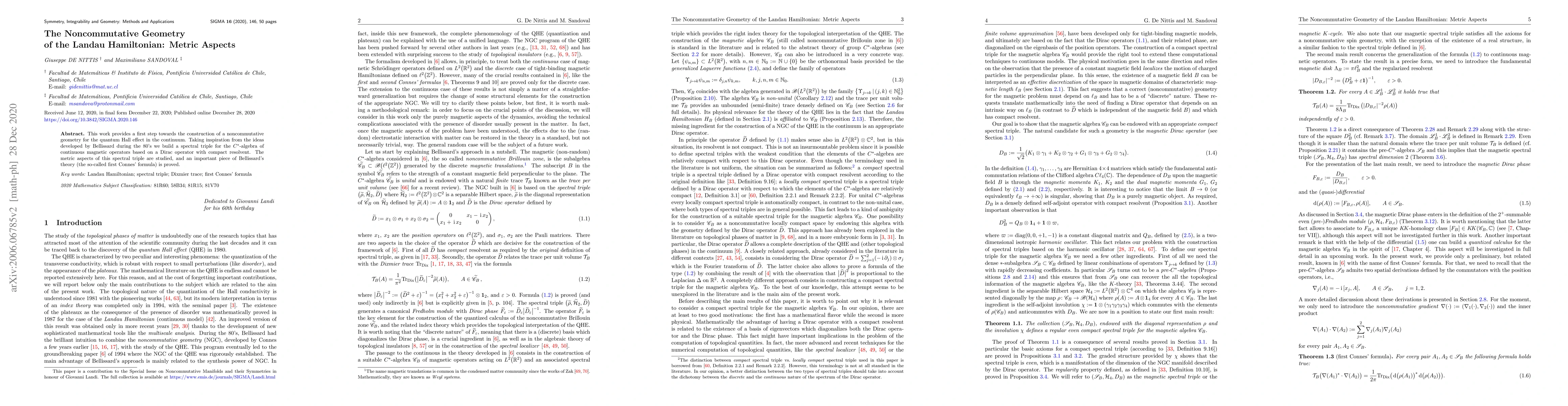 This paper constructs a spectral triple for the $C^*$-algebra of continuous magnetic operators inspired by Bellissard's ideas, focusing on the metric aspects, and proves an essential part of Bellissard's theory, the first Connes' formula, for the quantum Hall effect.