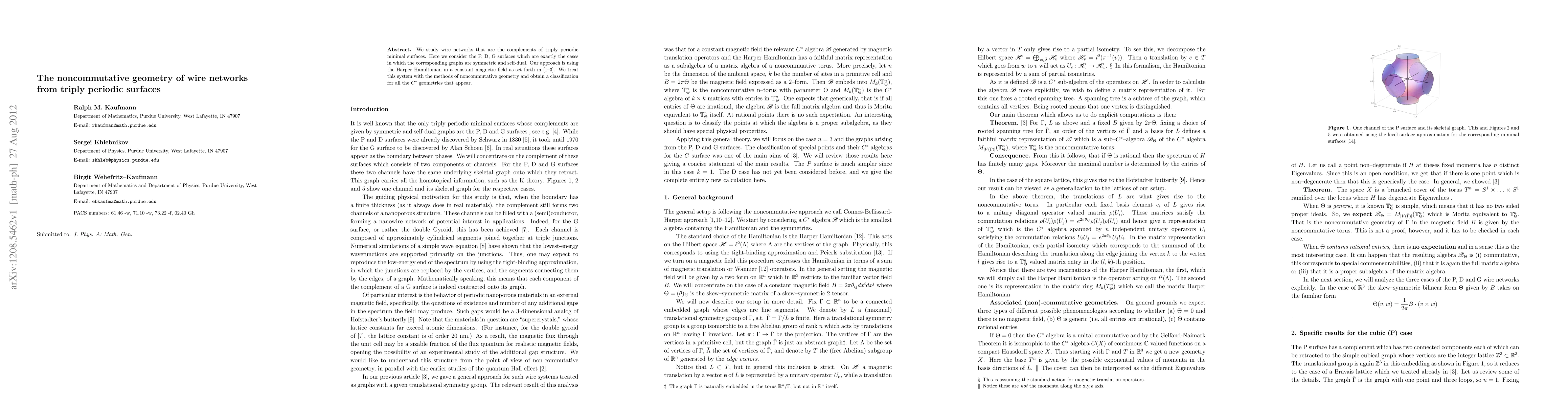 We study wire networks that are the complements of triply periodic minimal surfaces. Here we consider the P, D, G surfaces which are exactly the cases in which the corresponding graphs are symmetric and self-dual. Our approach is using the Harper Hamiltonian in a constant magnetic field. We treat this system with the methods of noncommutative geometry and obtain a classification for all the $C^*$ geometries that appear.