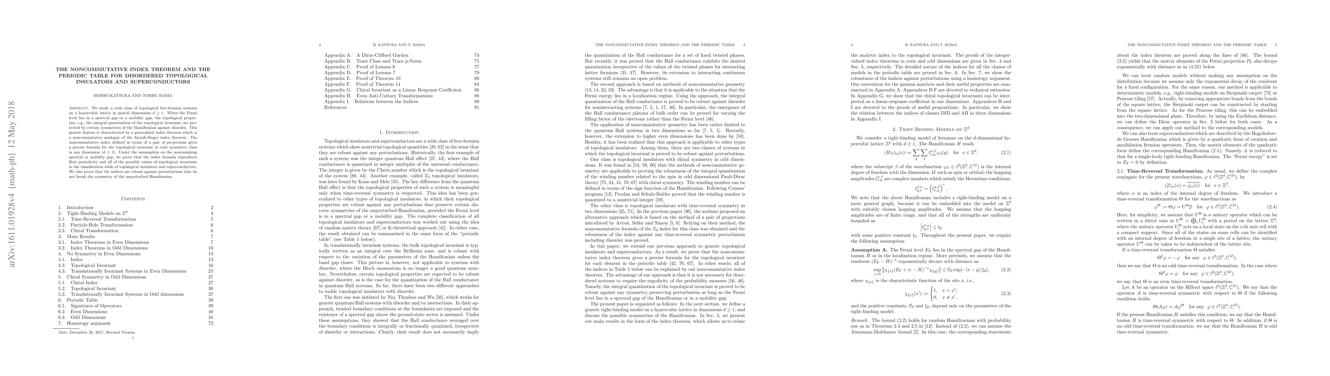This paper establishes a generalized noncommutative index theorem for topological free-fermion systems on hypercubic lattices, showing that the topological invariants remain quantized and protected by symmetries even in the presence of disorder. The theorem reproduces Bott periodicity and classifies topological insulators and superconductors, demonstrating robustness against symmetry-preserving perturbations.