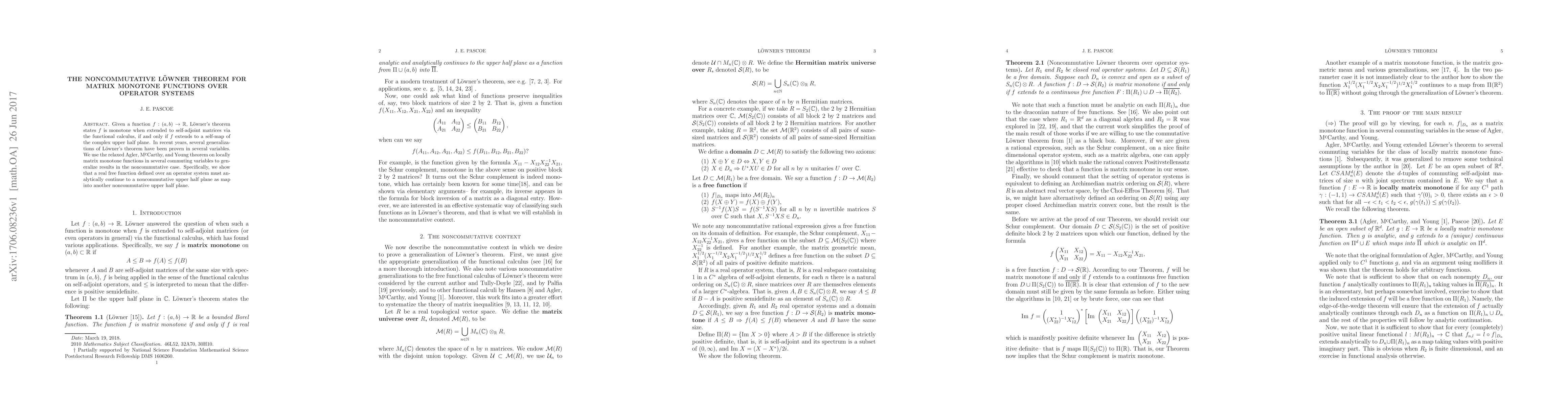 Summary: This paper generalizes Lowner's theorem to noncommutative settings, showing that a matrix monotone function over an operator system must analytically extend to a map in the noncommutative upper half plane. The extension is based on the Agler, McCarthy, and Young theorem for locally matrix monotone functions.