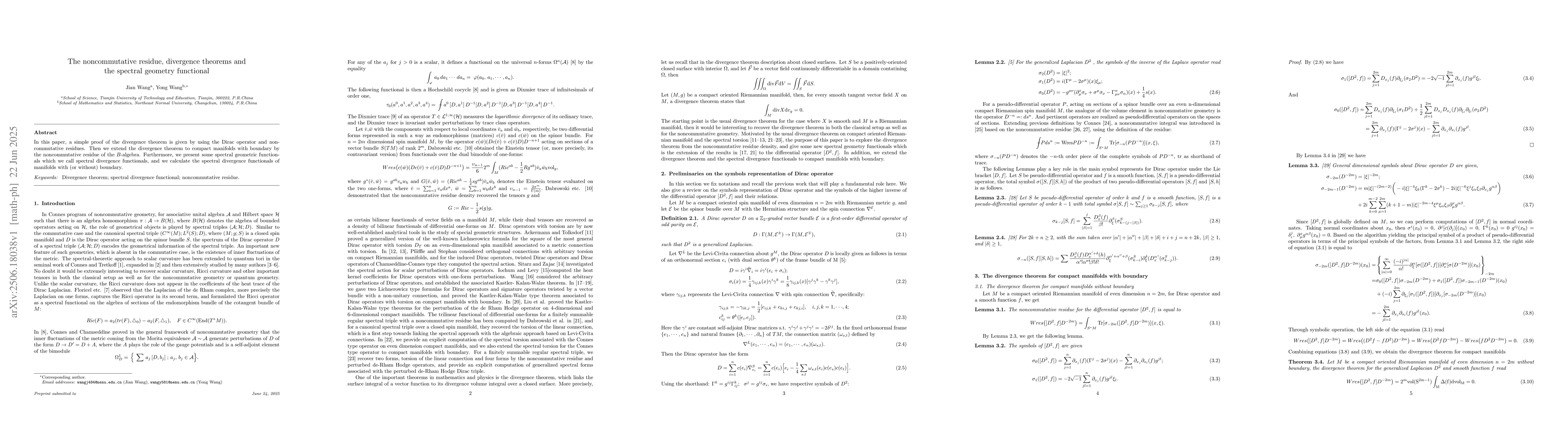 In this paper, a simple proof of the divergence theorem is given by using the Dirac operator and noncommutative residues. Then we extend the divergence theorem to compact manifolds with boundary by the noncommutative residue of the B-algebra. Furthermore, we present some spectral geometric functionals which we call spectral divergence functionals, and we calculate the spectral divergence functionals of manifolds with (or without) boundary.