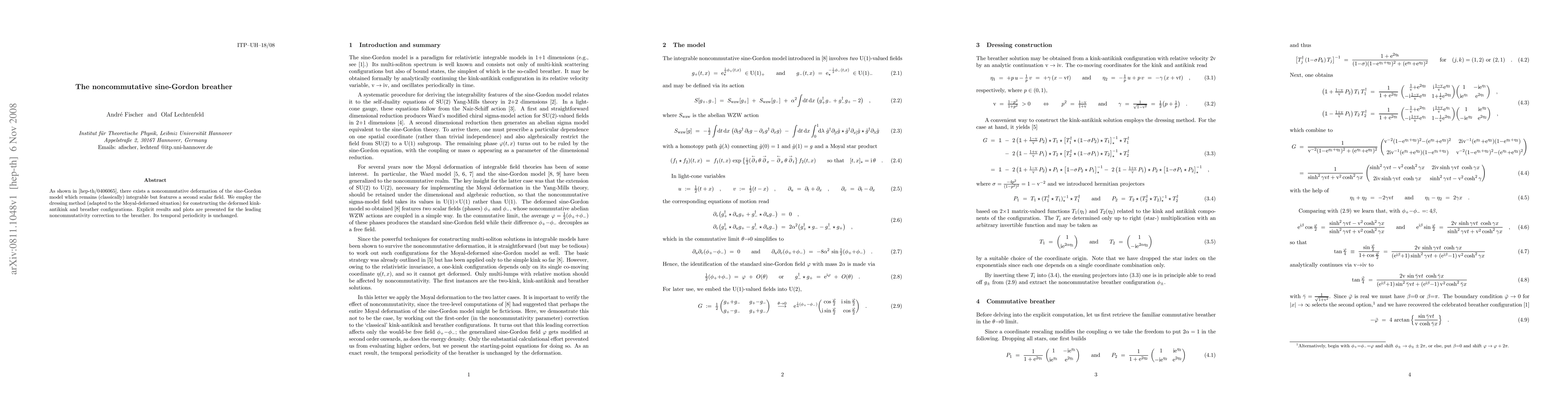As shown in [hep-th/0406065], there exists a noncommutative deformation of the sine-Gordon model which remains (classically) integrable but features a second scalar field. We employ the dressing method (adapted to the Moyal-deformed situation) for constructing the deformed kink-antikink and breather configurations. Explicit results and plots are presented for the leading noncommutativity correction to the breather. Its temporal periodicity is unchanged.