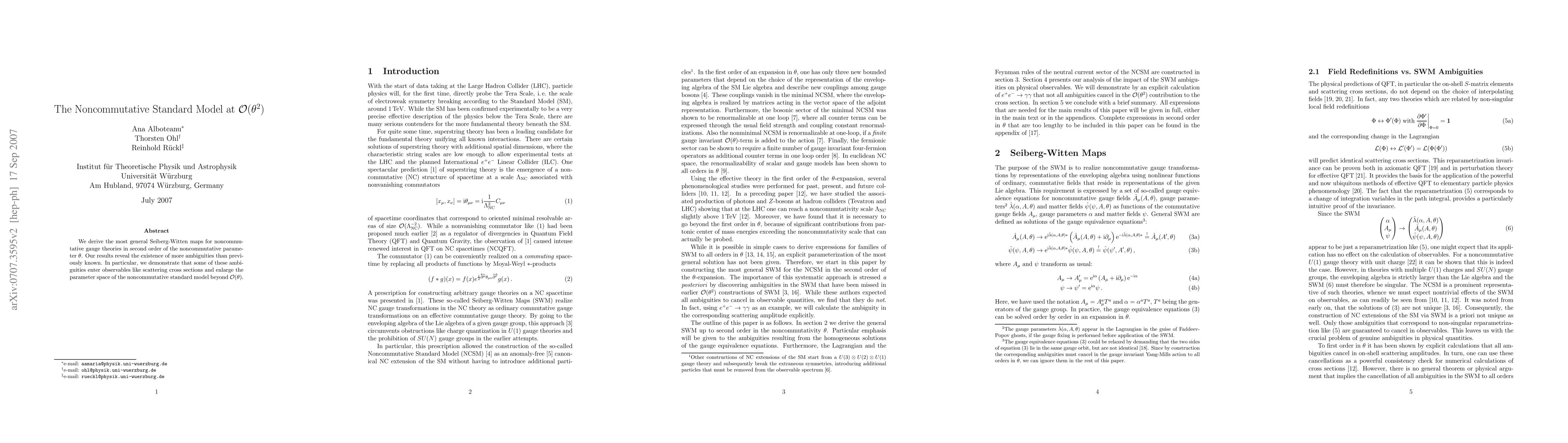 This paper derives the most general Seiberg-Witten maps for noncommutative gauge theories up to second order in the noncommutative parameter theta, revealing new ambiguities that affect observables such as scattering cross sections and expand the parameter space of the noncommutative standard model beyond linear theta terms.