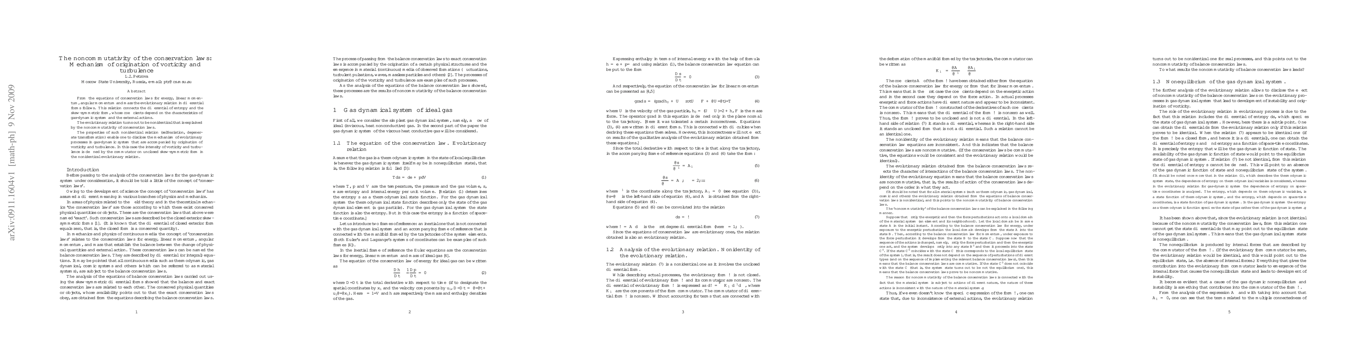 This paper explores the noncommutativity of conservation laws, revealing a nonidentical evolutionary relation that connects entropy and skew-symmetric forms. The study identifies the mechanism behind the emergence of vorticity and turbulence in gas-dynamic systems, attributing their intensity to the commutator of the unclosed skew-symmetric form.