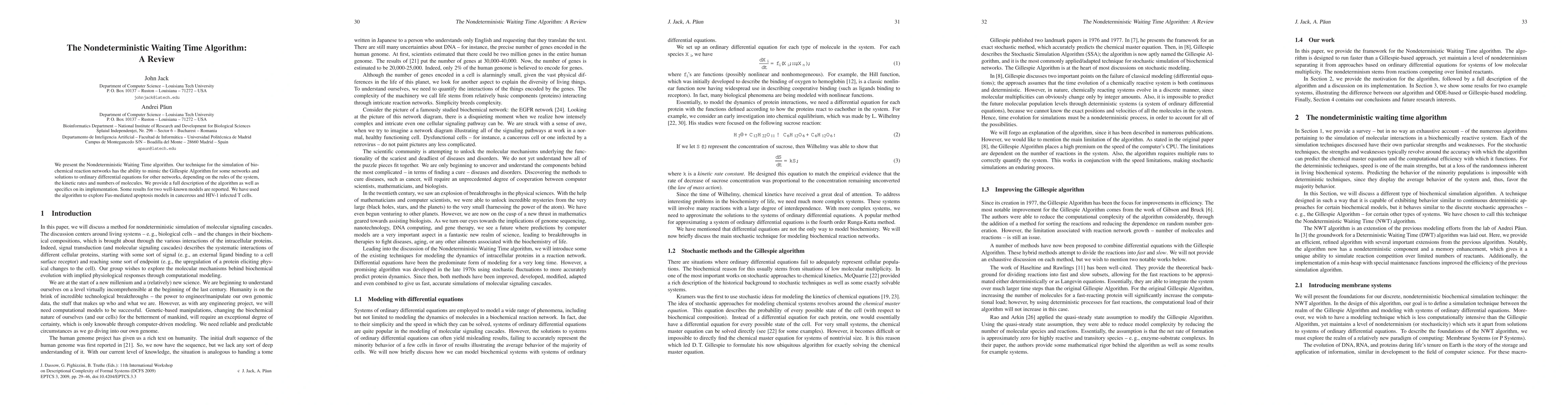 We present briefly the Nondeterministic Waiting Time algorithm. Our technique for the simulation of biochemical reaction networks has the ability to mimic the Gillespie Algorithm for some networks and solutions to ordinary differential equations for other networks, depending on the rules of the system, the kinetic rates and numbers of molecules. We provide a full description of the algorithm as well as specifics on its implementation. Some results for two well-known models are reported. We have used the algorithm to explore Fas-mediated apoptosis models in cancerous and HIV-1 infected T cells.