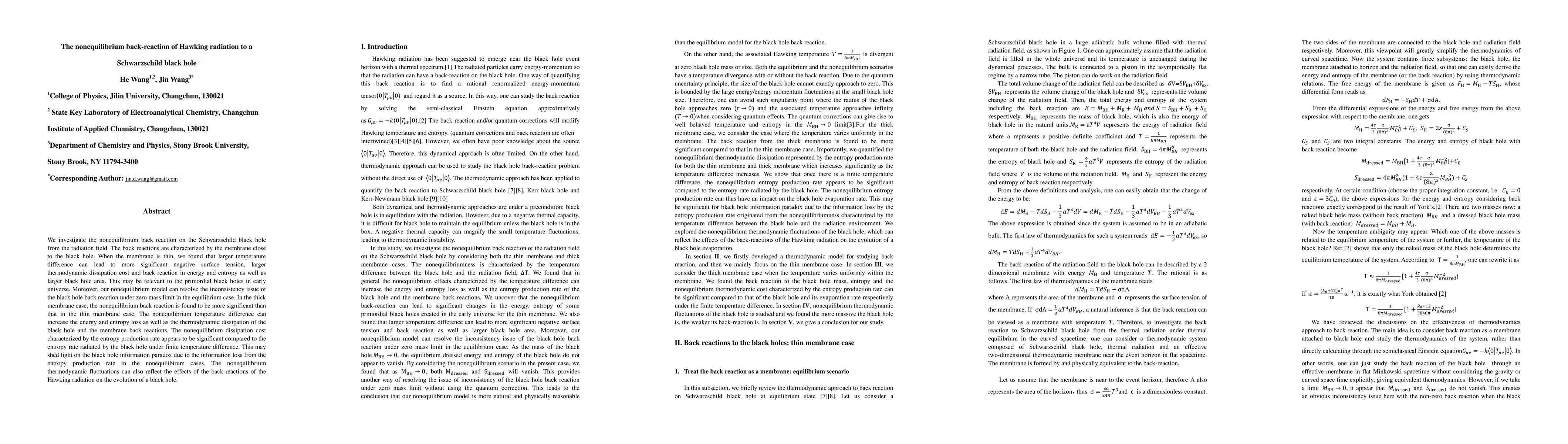 This paper examines the nonequilibrium back-reaction of Hawking radiation on a Schwarzschild black hole, finding that larger temperature differences lead to significant negative surface tension and increased thermodynamic dissipation. The nonequilibrium model resolves the inconsistency of black hole back-reaction under zero mass limit, suggesting implications for the black hole information paradox and primordial black holes in the early universe.