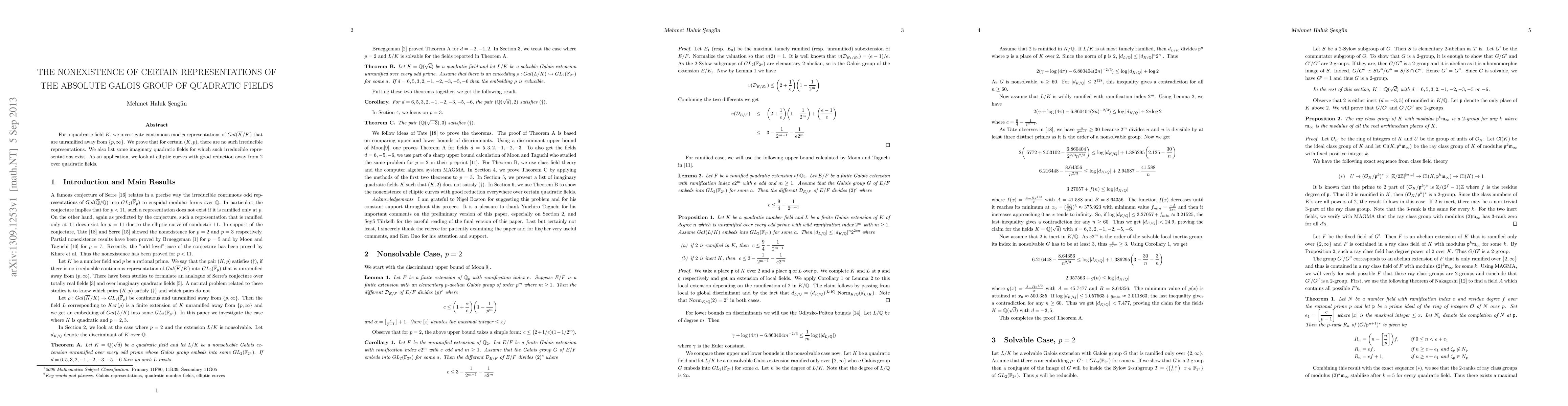 This paper proves the nonexistence of certain irreducible continuous mod p representations of the absolute Galois group for specific quadratic fields K, unramified away from p and infinity. It also identifies some imaginary quadratic fields where such representations do exist, with an application to elliptic curves over these fields.