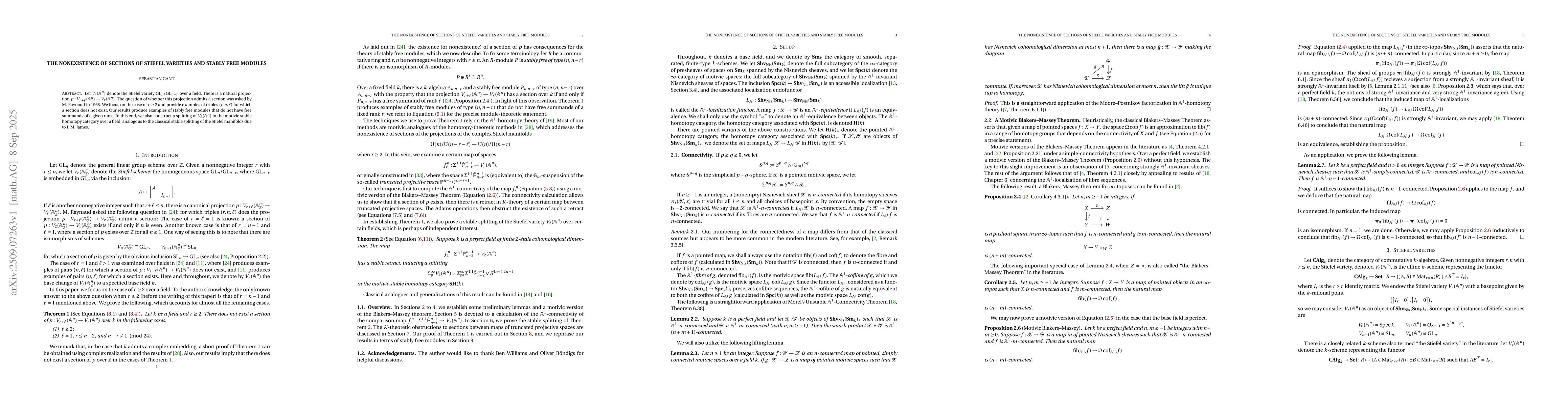 Let $V_r(\mathbb{A}^n)$ denote the Stiefel variety ${\rm GL}_n/{\rm GL}_{n-r}$ over a field. There is a natural projection $p: V_{r+\ell}(\mathbb{A}^n) \to V_r(\mathbb{A}^n)$. The question of whether this projection admits a section was asked by M. Raynaud in 1968. We focus on the case of $r \ge 2$ and provide examples of triples $(r,n,\ell)$ for which a section does not exist. Our results produce examples of stably free modules that do not have free summands of a given rank. To this end, we also construct a splitting of $V_2(\mathbb{A}^n)$ in the motivic stable homotopy category over a field, analogous to the classical stable splitting of the Stiefel manifolds due to I. M. James.