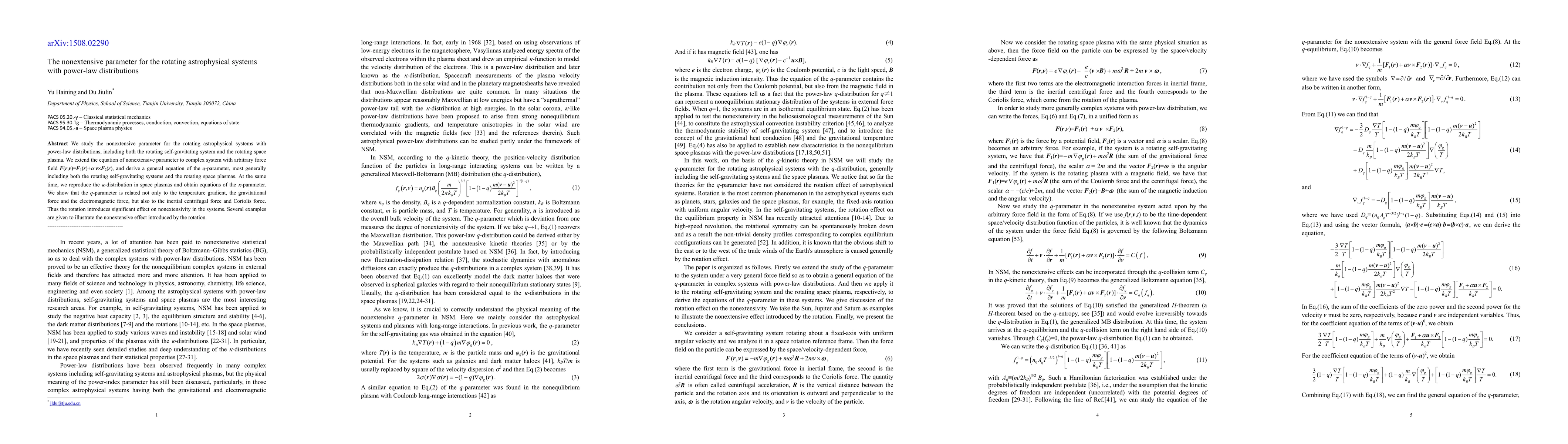 This paper investigates the nonextensive parameter (q-parameter) in rotating astrophysical systems with power-law distributions, deriving a general equation that includes both rotating self-gravitating systems and space plasmas. It demonstrates that rotation significantly influences nonextensivity through various forces, including centrifugal and Coriolis forces.