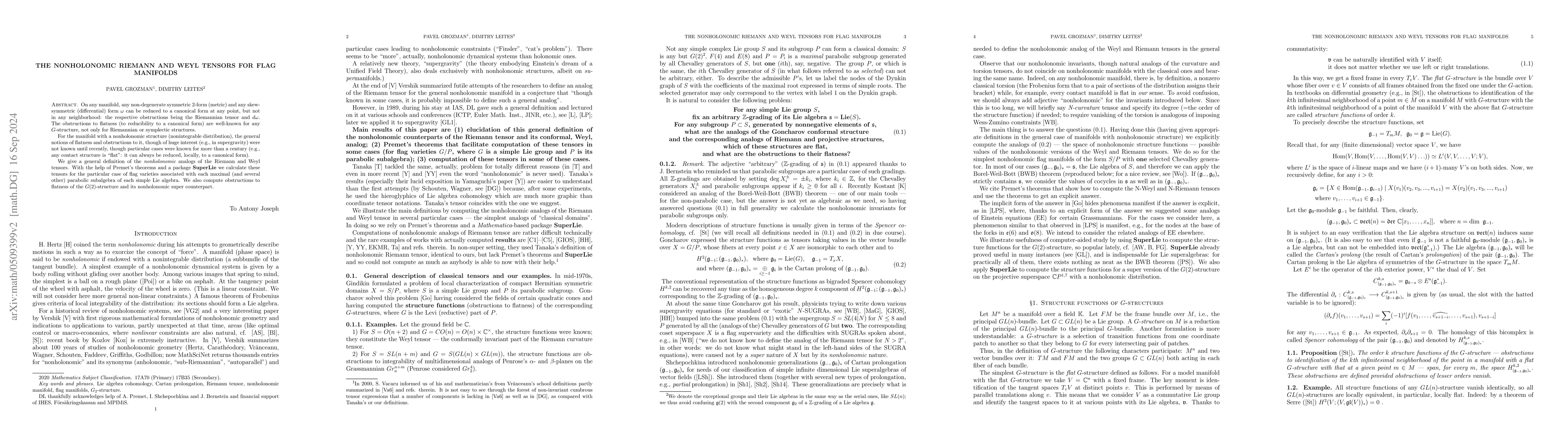 On any manifold, any non-degenerate symmetric 2-form (metric) and any skew-symmetric (differential) form W can be reduced to a canonical form at any point, but not in any neighborhood: the respective obstructions being the Riemannian tensor and dW. The obstructions to flatness (to reducibility to a canonical form) are well-known for any G-structure, not only for Riemannian or symplectic structures. For the manifold with a nonholonomic structure (nonintegrable distribution), the general notions of flatness and obstructions to it, though of huge interest (e.g., in supergravity) were not known until recently, though particular cases were known for more than a century (e.g., any contact structure is ``flat'': it can always be reduced, locally, to a canonical form). We give a general definition of the NONHOLONOMIC analogs of the Riemann and Weyl tensors. With the help of Premet's theorems and a package SuperLie we calculate these tensors for the particular case of flag varieties associated with each maximal (and several other) parabolic subalgebra of each simple Lie algebra. We also compute obstructions to flatness of the G(2)-structure and its nonholonomic super counterpart.