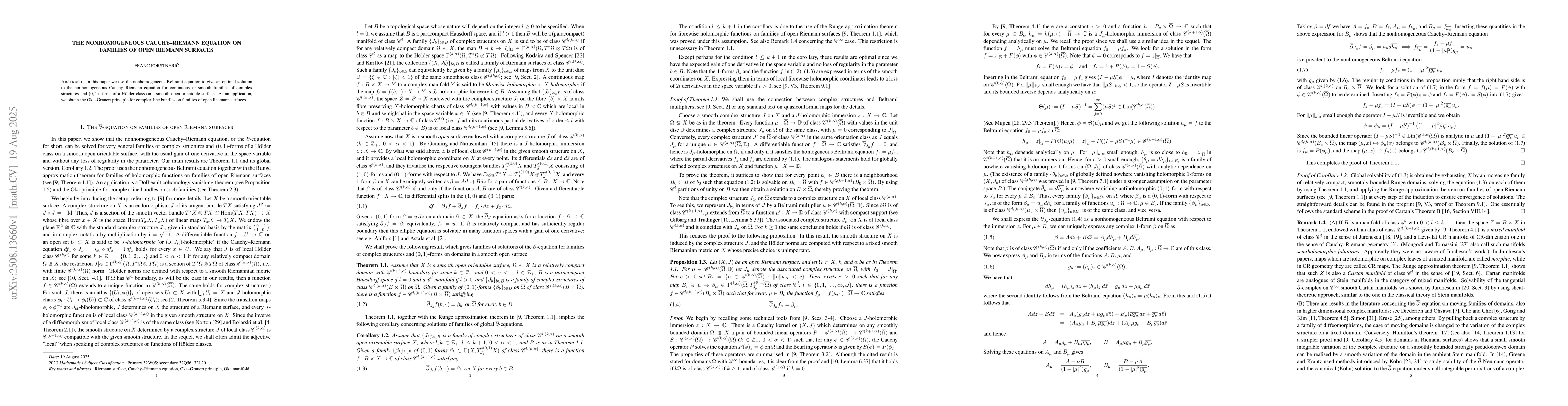 In this paper we use the nonhomogeneous Beltrami equation to give an optimal solution to the nonhomogeneous Cauchy-Riemann equation for continuous or smooth families of complex structures and $(0,1)$-forms of a H\"older class on a smooth open orientable surface. As an application, we obtain the Oka-Grauert principle for complex line bundles on families of open Riemann surfaces.