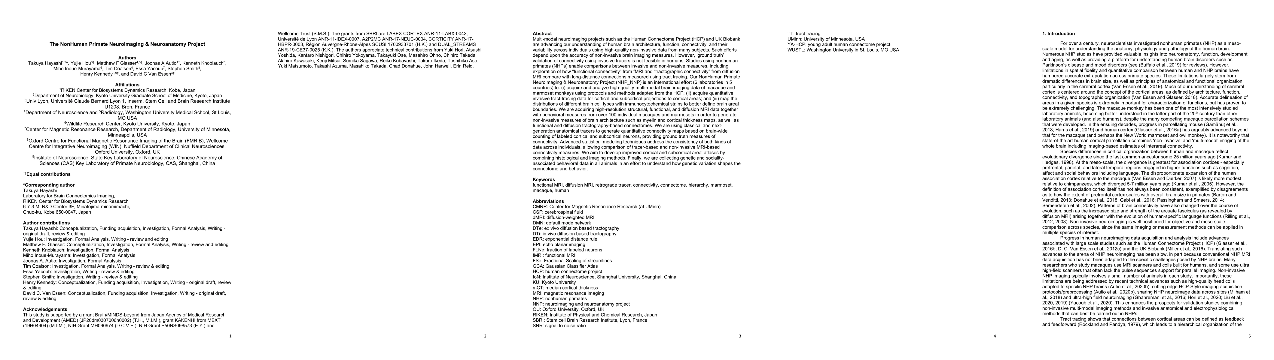 Multi-modal neuroimaging projects are advancing our understanding of human brain architecture, function, connectivity using high-quality non-invasive data from many subjects. However, ground truth validation of connectivity using invasive tracers is not feasible in humans. Our NonHuman Primate Neuroimaging & Neuroanatomy Project (NHP_NNP) is an international effort (6 laboratories in 5 countries) to: (i) acquire and analyze high-quality multi-modal brain imaging data of macaque and marmoset monkeys using protocols and methods adapted from the HCP; (ii) acquire quantitative invasive tract-tracing data for cortical and subcortical projections to cortical areas; and (iii) map the distributions of different brain cell types with immunocytochemical stains to better define brain areal boundaries. We are acquiring high-resolution structural, functional, and diffusion MRI data together with behavioral measures from over 100 individual macaques and marmosets in order to generate non-invasive measures of brain architecture such as myelin and cortical thickness maps, as well as functional and diffusion tractography-based connectomes. We are using classical and next-generation anatomical tracers to generate quantitative connectivity maps based on brain-wide counting of labeled cortical and subcortical neurons, providing ground truth measures of connectivity. Advanced statistical modeling techniques address the consistency of both kinds of data across individuals, allowing comparison of tracer-based and non-invasive MRI-based connectivity measures. We aim to develop improved cortical and subcortical areal atlases by combining histological and imaging methods. Finally, we are collecting genetic and sociality-associated behavioral data in all animals in an effort to understand how genetic variation shapes the connectome and behavior.