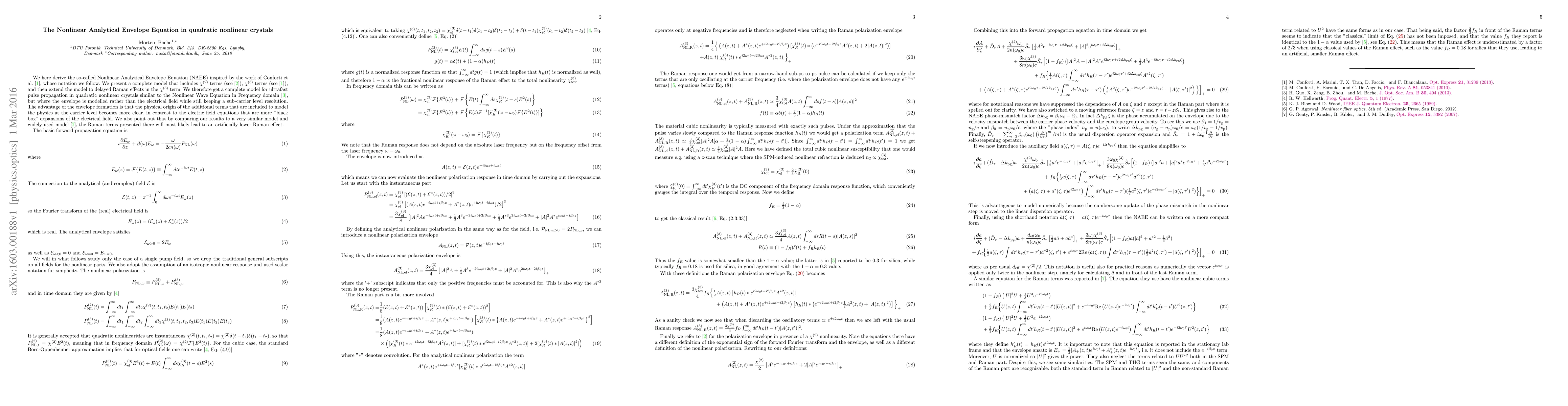 We here derive the so-called Nonlinear Analytical Envelope Equation (NAEE) inspired by the work of Conforti et al. [M. Conforti, A. Marini, T. X. Tran, D. Faccio, and F. Biancalana, "Interaction between optical fields and their conjugates in nonlinear media," Opt. Express 21, 31239-31252 (2013)], whose notation we follow. We present a complete model that includes $\chi^{(2)}$ terms [M. Conforti, F. Baronio, and C. De Angelis, "Nonlinear envelope equation for broadband optical pulses in quadratic media," Phys. Rev. A 81, 053841 (2010)], $\chi^{(3)}$ terms, and then extend the model to delayed Raman effects in the $\chi^{(3)}$ term. We therefore get a complete model for ultrafast pulse propagation in quadratic nonlinear crystals similar to the Nonlinear Wave Equation in Frequency domain [H. Guo, X. Zeng, B. Zhou, and M. Bache, "Nonlinear wave equation in frequency domain: accurate modeling of ultrafast interaction in anisotropic nonlinear media," J. Opt. Soc. Am. B 30, 494-504 (2013)], but where the envelope is modelled rather than the electrical field while still keeping a sub-carrier level resolution. The advantage of the envelope formation is that the physical origin of the additional terms that are included to model the physics at the carrier level becomes more clear, in contrast to the electric field equations that are more "black box" expansions of the electrical field. We also point out that by comparing our results to a very similar model and widely used model [G. Genty, P. Kinsler, B. Kibler, and J. M. Dudley, "Nonlinear envelope equation modeling of sub-cycle dynamics and harmonic generation in nonlinear waveguides," Opt. Express 15, 5382-5387 (2007)], the Raman terms presented there will most likely lead to an artificially lower Raman effect.