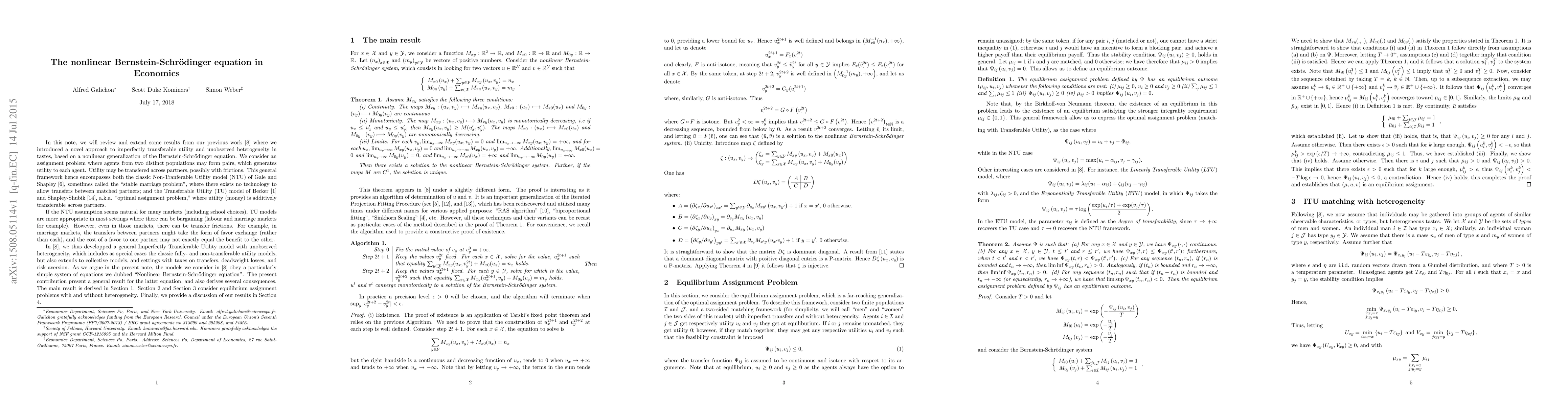 In this paper we relate the Equilibrium Assignment Problem (EAP), which is underlying in several economics models, to a system of nonlinear equations that we call the "nonlinear Bernstein-Schr\"odinger system", which is well-known in the linear case, but whose nonlinear extension does not seem to have been studied. We apply this connection to derive an existence result for the EAP, and an efficient computational method.