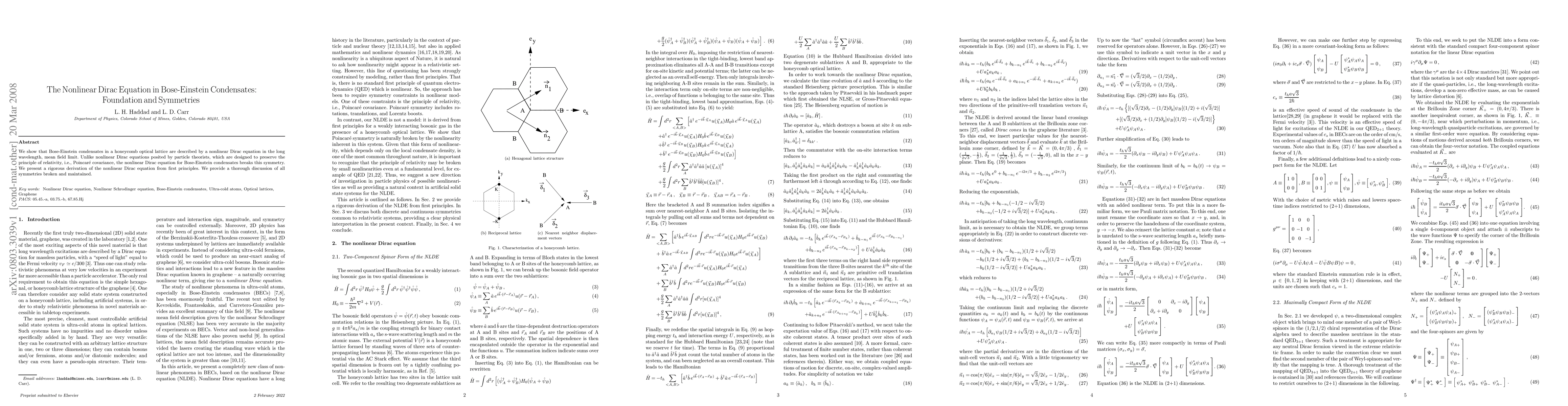 This paper derives a nonlinear Dirac equation for Bose-Einstein condensates in a honeycomb optical lattice, revealing a departure from Poincaré covariance unlike traditional particle theories. It rigorously establishes the equation from first principles and discusses the symmetries that are broken and preserved.