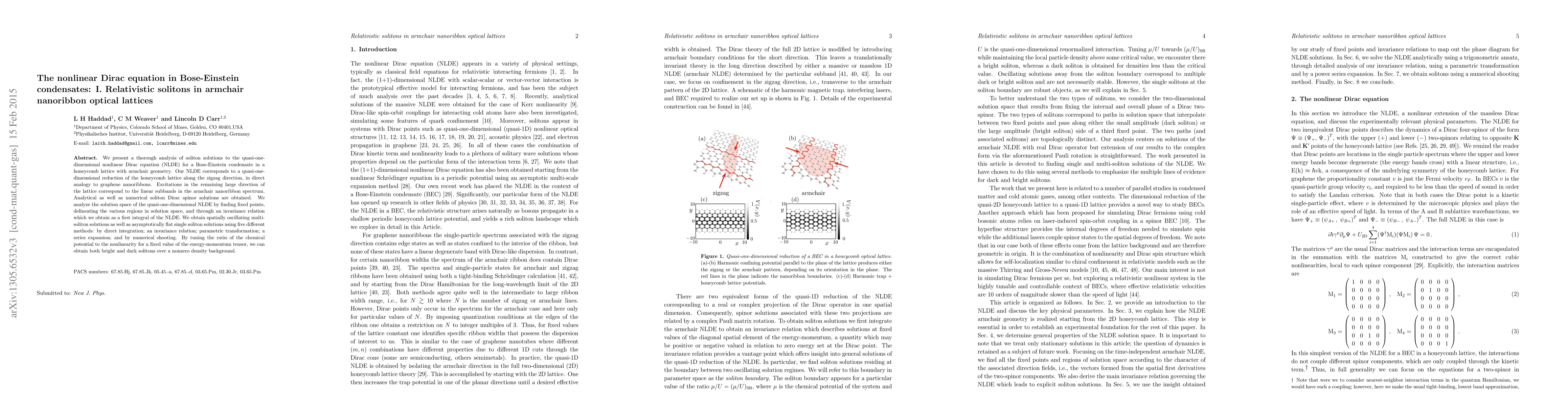We present a thorough analysis of soliton solutions to the quasi-one-dimensional nonlinear Dirac equation (NLDE) for a Bose-Einstein condensate in a honeycomb lattice with armchair geometry. Our NLDE corresponds to a quasi-one-dimensional reduction of the honeycomb lattice along the zigzag direction, in direct analogy to graphene nanoribbons. Excitations in the remaining large direction of the lattice correspond to the linear subbands in the armchair nanoribbon spectrum. Analytical as well as numerical soliton Dirac spinor solutions are obtained. We analyze the solution space of the quasi-one-dimensional NLDE by finding fixed points, delineating the various regions in solution space, and through an invariance relation which we obtain as a first integral of the NLDE. We obtain spatially oscillating multi-soliton solutions as well as asymptotically flat single soliton solutions using five different methods: by direct integration; an invariance relation; parametric transformation; a series expansion; and by numerical shooting. By tuning the ratio of the chemical potential to the nonlinearity for a fixed value of the energy-momentum tensor, we can obtain both bright and dark solitons over a nonzero density background.