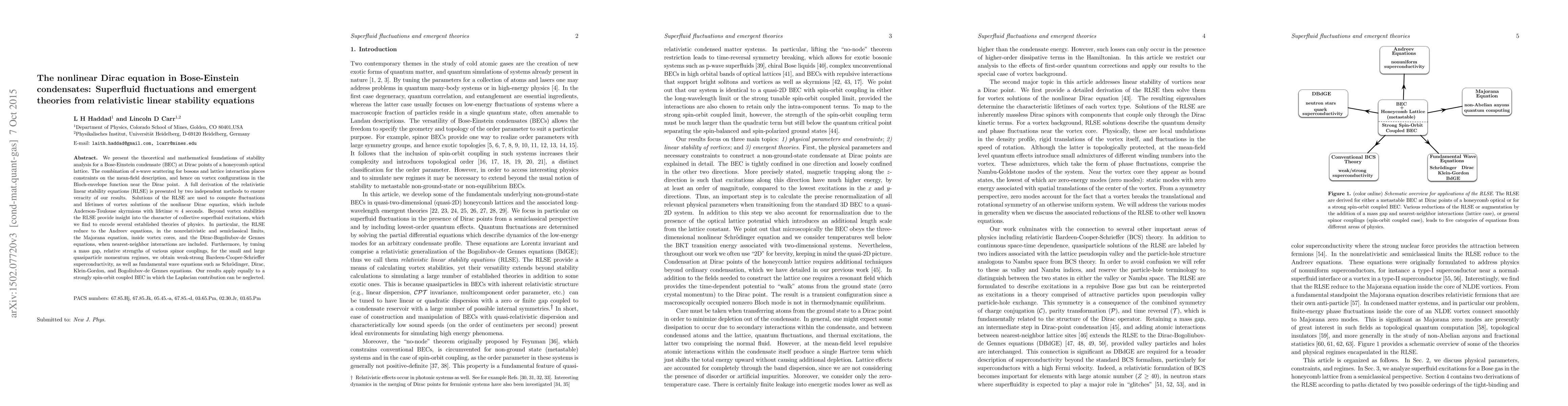 We present the theoretical and mathematical foundations of stability analysis for a Bose-Einstein condensate (BEC) at Dirac points of a honeycomb optical lattice. The combination of s-wave scattering for bosons and lattice interaction places constraints on the mean-field description, and hence on vortex configurations in the Bloch-envelope function near the Dirac point. A full derivation of the relativistic linear stability equations (RLSE) is presented by two independent methods to ensure veracity of our results. Solutions of the RLSE are used to compute fluctuations and lifetimes of vortex solutions of the nonlinear Dirac equation, which include Mermin-Ho and Anderson-Toulouse skyrmions, with lifetime $\approx 4$ seconds. Beyond vortex stabilities the RLSE provide insight into the character of collective superfluid excitations, which we find to encode several established theories of physics. In particular, the RLSE reduce to the Andreev equations, in the nonrelativistic and semiclassical limits, the Majorana equation, inside vortex cores, and the Dirac-Bogoliubov-de Gennes equations, when nearest-neighbor interactions are included. Furthermore, by tuning a mass gap, relative strengths of various spinor couplings, for the small and large quasiparticle momentum regimes, we obtain weak-strong Bardeen-Cooper-Schrieffer superconductivity, as well as fundamental wave equations such as Schr\"odinger, Dirac, Klein-Gordon, and Bogoliubov-de Gennes equations. Our results apply equally to a strongly spin-orbit coupled BEC in which the Laplacian contribution can be neglected.