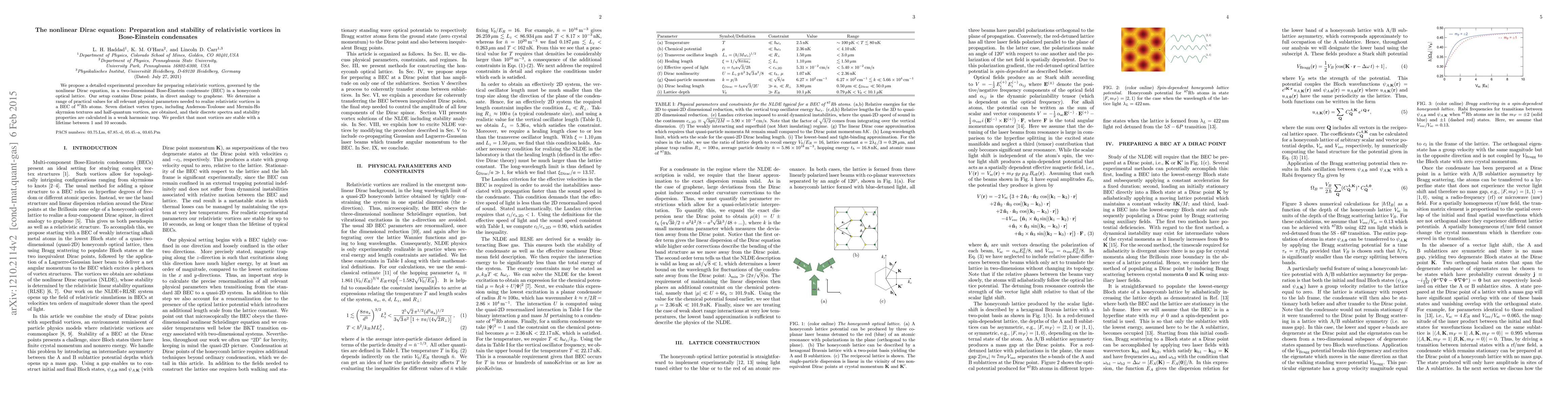 We propose a detailed experimental procedure for preparing relativistic vortices, governed by the nonlinear Dirac equation, in a two-dimensional Bose-Einstein condensate (BEC) in a honeycomb optical lattice. Our setup contains Dirac points, in direct analogy to graphene. We determine a range of practical values for all relevant physical parameters needed to realize relativistic vortices in a BEC of $^{87}\mathrm{Rb}$ atoms. Seven distinct vortex types, including Anderson-Toulouse and Mermin-Ho skyrmion textures and half-quantum vortices, are obtained, and their discrete spectra and stability properties are calculated in a weak harmonic trap. We predict that most vortices are stable with a lifetime between $1$ and $10$ seconds.