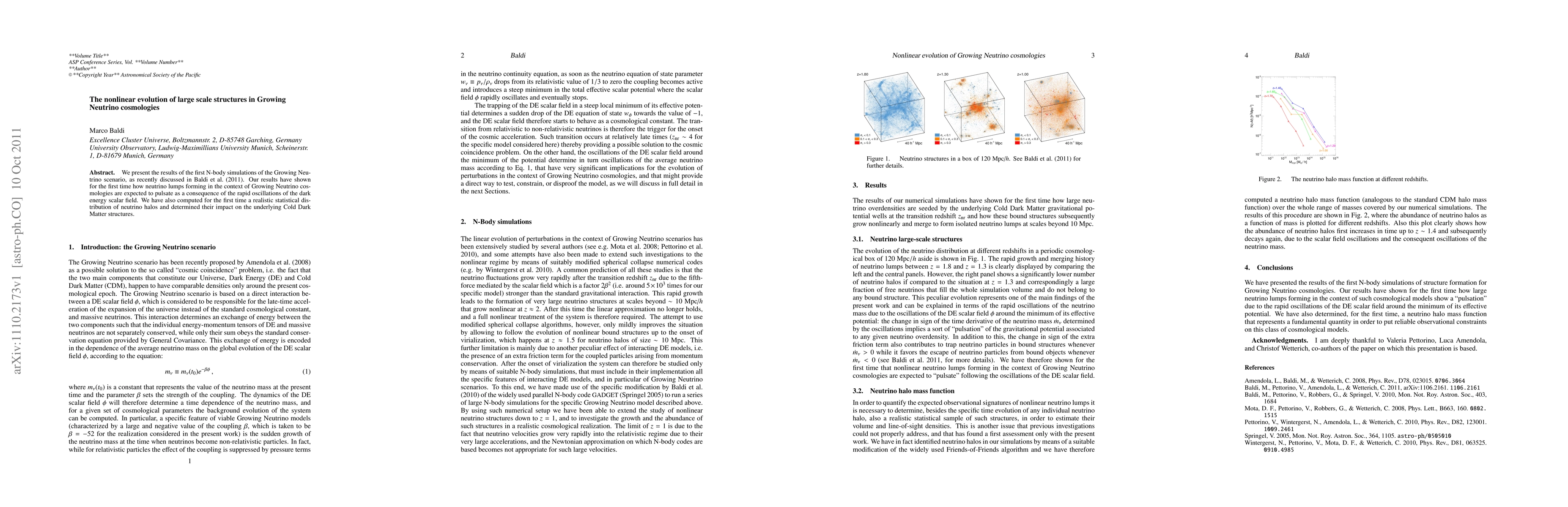 We present the results of the first N-body simulations of the Growing Neutrino scenario, as recently discussed in Baldi et al. (2011). Our results have shown for the first time how neutrino lumps forming in the context of Growing Neutrino cosmologies are expected to pulsate as a consequence of the rapid oscillations of the dark energy scalar field. We have also computed for the first time a realistic statistical distribution of neutrino halos and determined their impact on the underlying Cold Dark Matter structures.