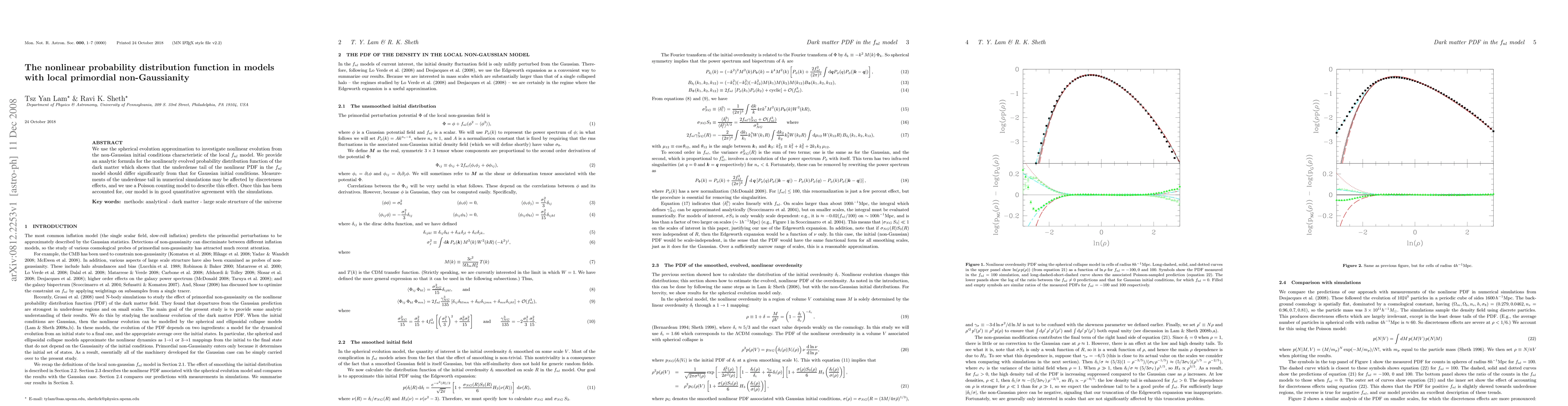 We use the spherical evolution approximation to investigate nonlinear evolution from the non-Gaussian initial conditions characteristic of the local f_nl model. We provide an analytic formula for the nonlinearly evolved probability distribution function of the dark matter which shows that the under-dense tail of the nonlinear PDF in the f_nl model should differ significantly from that for Gaussian initial conditions. Measurements of the under-dense tail in numerical simulations may be affected by discreteness effects, and we use a Poisson counting model to describe this effect. Once this has been accounted for, our model is in good quantitative agreement with the simulations.