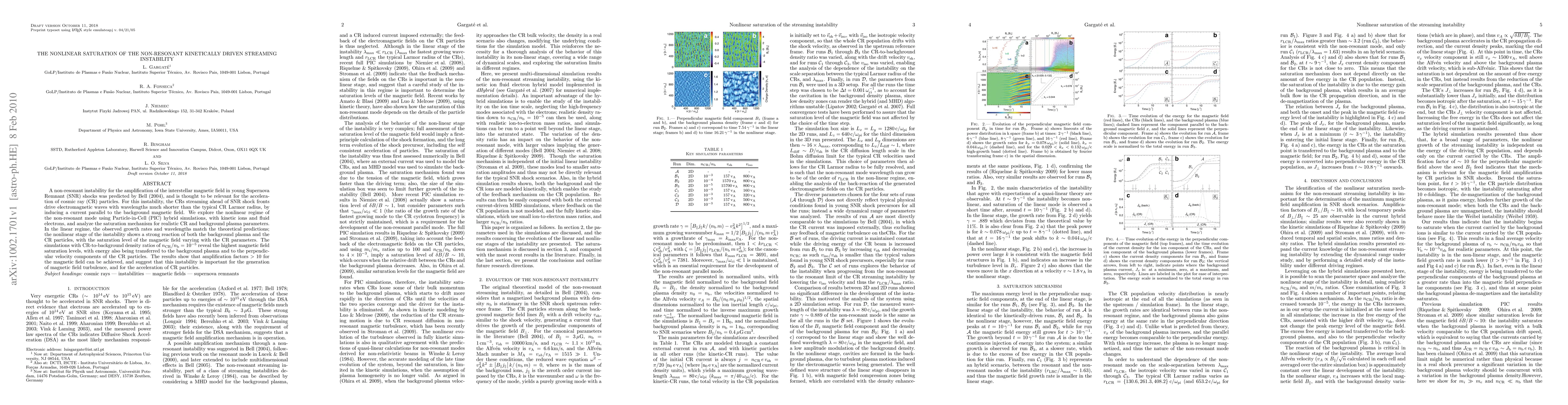 This paper investigates the nonlinear saturation of the non-resonant kinetically driven streaming instability in young Supernova Remnant shocks, using Particle-in-Cell simulations. The study finds that the instability can amplify magnetic fields by factors greater than 10, suggesting its importance in generating magnetic field turbulence and accelerating cosmic rays.