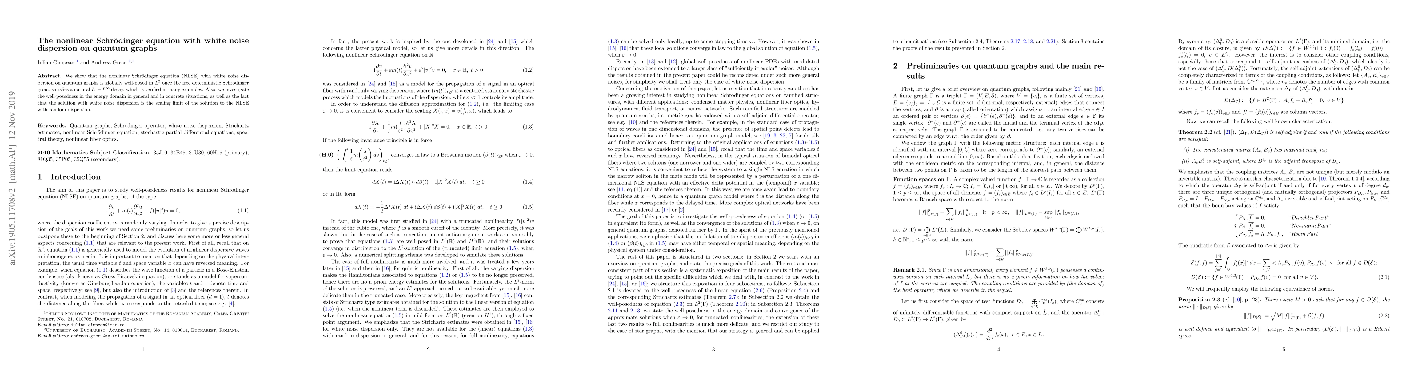 We show that the nonlinear Schr\"{o}dinger equation (NLSE) with white noise dispersion on quantum graphs is globally well-posed in $L^2$ once the free deterministic Schr\"{o}dinger group satisfies a natural $L^1-L^{\infty}$ decay, which is verified in many examples. Also, we investigate the well-posedness in the energy domain in general and in concrete situations, as well as the fact that the solution with white noise dispersion is the scaling limit of the solution to the NLSE with random dispersion.