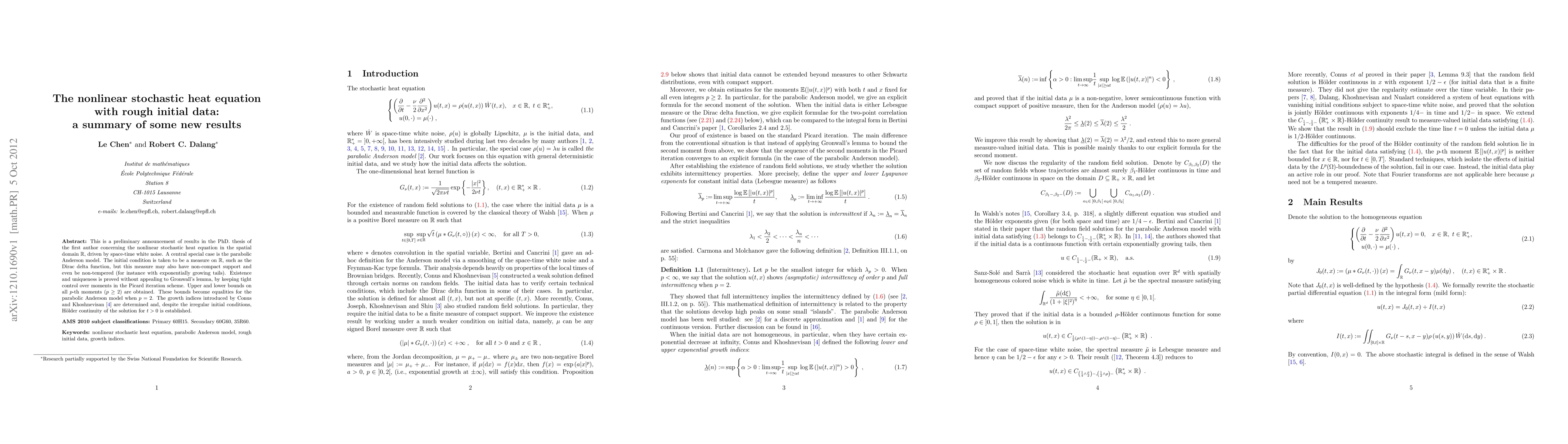 This is a preliminary announcement of results in the PhD. thesis of the first author concerning the nonlinear stochastic heat equation in the spatial domain $\R$, driven by space-time white noise. A central special case is the parabolic Anderson model. The initial condition is taken to be a measure on $\R$, such as the Dirac delta function, but this measure may also have non-compact support and even be non-tempered (for instance with exponentially growing tails). Existence and uniqueness is proved without appealing to Gronwall's lemma, by keeping tight control over moments in the Picard iteration scheme. Upper and lower bounds on all $p$-th moments $(p\ge 2)$ are obtained. These bounds become equalities for the parabolic Anderson model when $p=2$. The growth indices introduced by Conus and Khoshnevisan (2010) are determined and, despite the irregular initial conditions, H\"older continuity of the solution for $t>0$ is established.