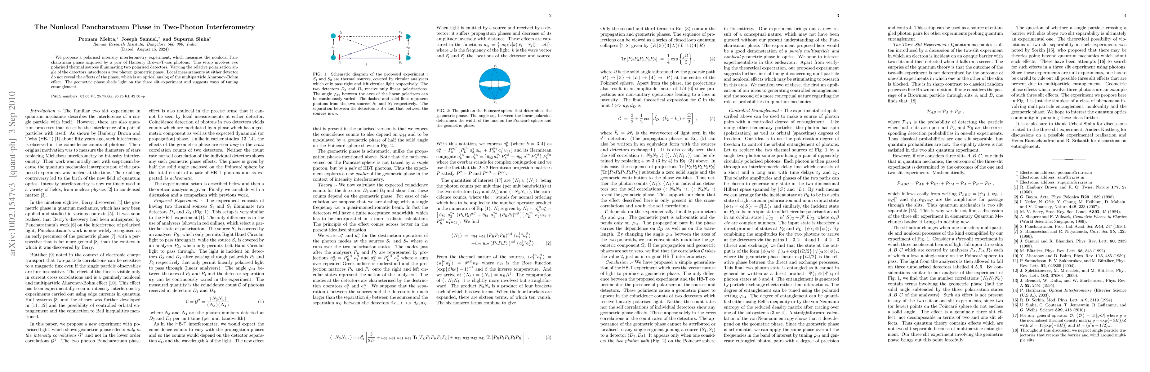 This paper proposes an experiment to measure the nonlocal Pancharatnam phase in two-photon interferometry using polarized thermal sources and detectors, revealing a geometric phase that mirrors the multiparticle Aharonov-Bohm effect and offers insights into the three slit experiment and entanglement tuning.