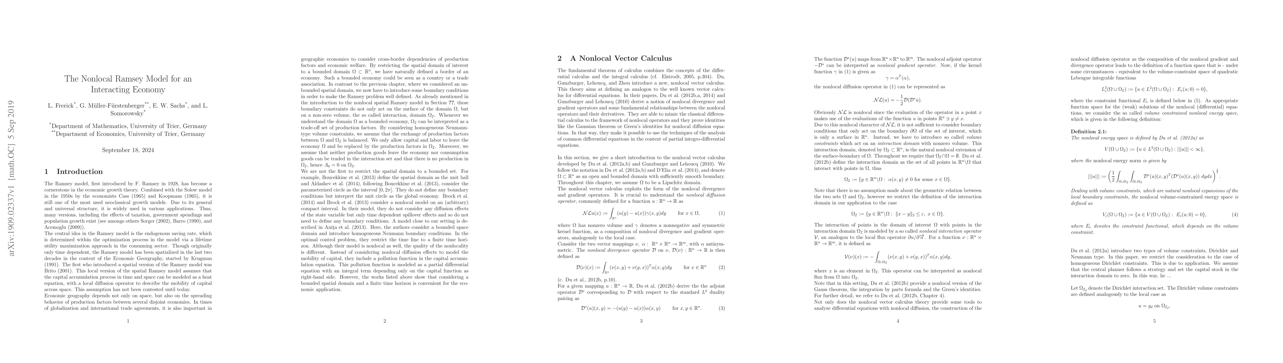 The Ramsey model, first introduced by F. Ramsey in 1928, has become a cornerstone in the economic growth theory. Combined with the Solow model in the 1950s by the economists Cass (1965) and Koopmans (1965), it is still one of the most used neoclassical growth models. Due to its general and universal structure, it is widely used in various applications. Thus, many versions, including the effects of taxation, government spendings and population growth exist (see amongs others Sorger (2002), Barro (1990), and Acemoglu (2009)). The central idea in the Ramsey model is the endogenous saving rate, which is determined within the optimization process in the model via a lifetime utility maximization approach in the consuming sector. Though originally only time dependent, the Ramsey model has been spatialized in the last two decades in the context of the Economic Geography, started by Krugman (1991). The first who introduced a spatial version of the Ramsey model was Brito (2001). This local version of the spatial Ramsey model assumes that the capital accumulation process in time and space can be modeled as a heat equation, with a local diffusion operator to describe the mobility of capital across space. This assumption has not been contested until today.
