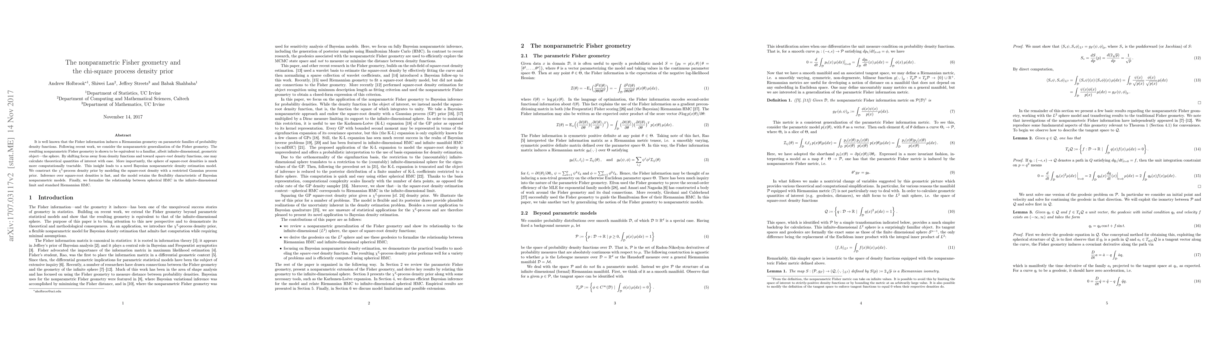 The paper presents a nonparametric extension of Fisher geometry, identifies it with the infinite-dimensional sphere, and develops a computationally efficient Bayesian nonparametric density estimation model based on spherical HMC.