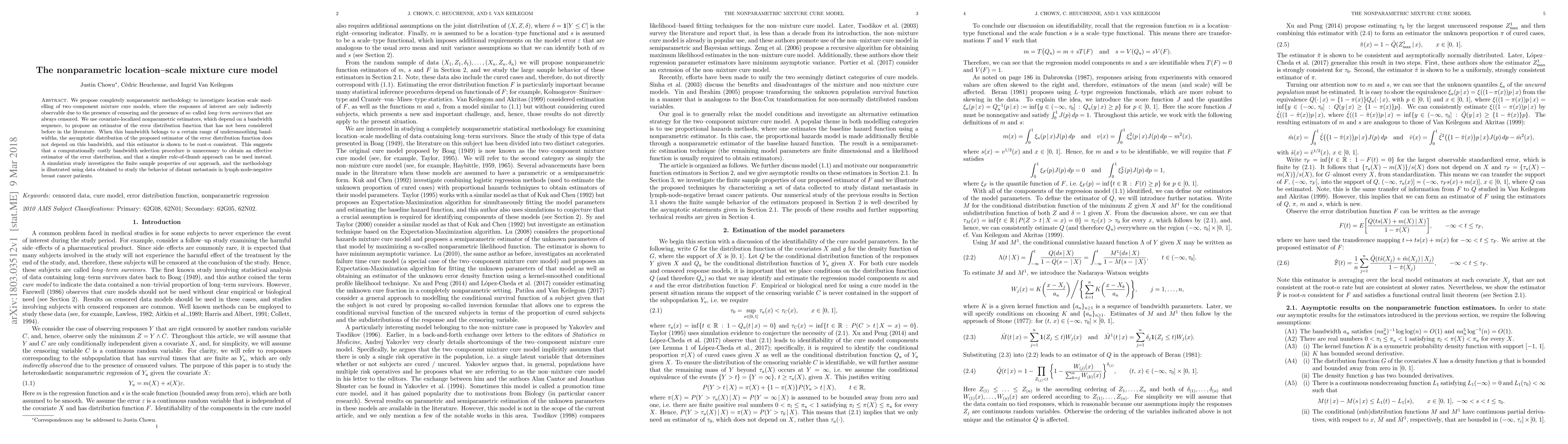 This paper proposes a novel nonparametric methodology for analyzing two-component mixture cure models, focusing on location-scale modeling with censored data and long-term survivors. The authors introduce a new estimator for the error distribution function that is root-n consistent, simplifying the bandwidth selection process.