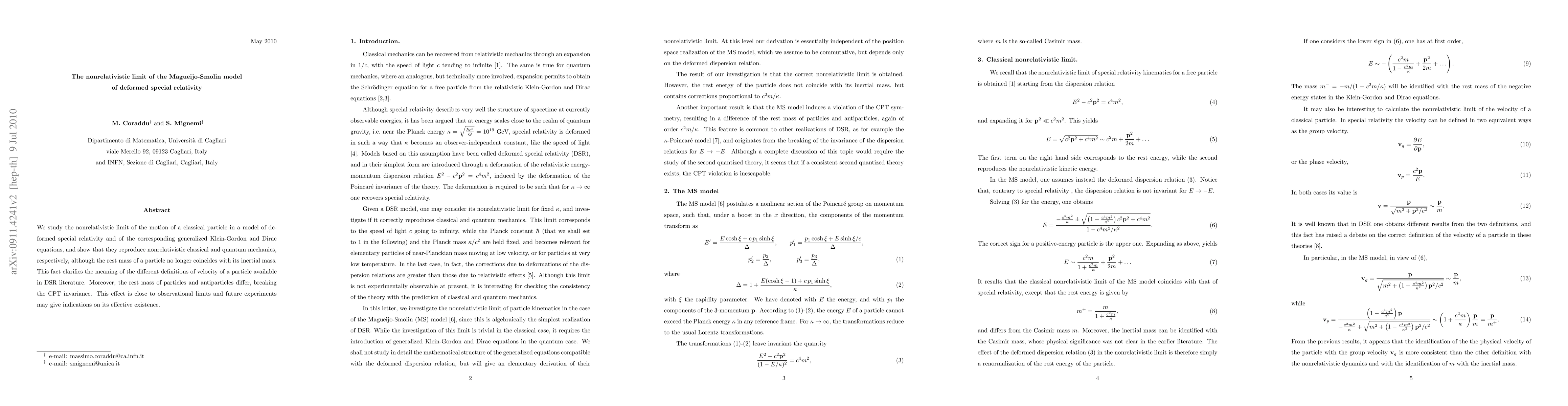 The research examines the nonrelativistic limit of Magueijo-Smolin's deformed special relativity model, showing that it aligns with classical and quantum mechanics respectively for particles and their antiparticles. However, it reveals a discrepancy where a particle's rest mass doesn't match its inertial mass, potentially breaking CPT invariance. This effect is near observable limits, suggesting future experiments could confirm its presence.