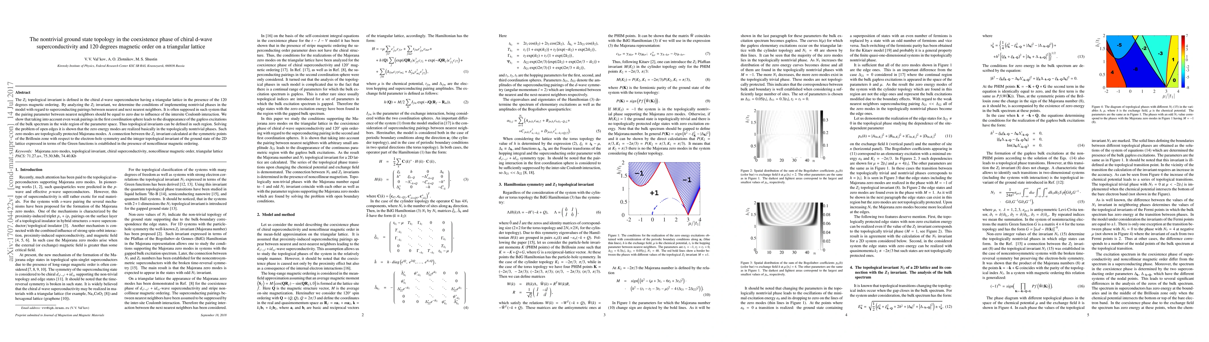 The Z2 topological invariant is defined in the chiral d-wave superconductor having a triangular lattice in the presence of the 120 degrees magnetic ordering. By analyzing the Z2 invariant, we determine the conditions of implementing nontrivial phases in the model with regard to superconducting pairings between nearest and next nearest neighbors. It is often supposed in such system that the pairing parameter between nearest neighbors should be equal to zero due to influence of the intersite Coulomb interaction. We show that taking into account even weak pairings in the first coordination sphere leads to the disappearance of the gapless excitations of the bulk spectrum in the wide region of the parameter space. Thus topological invariants can be defined in such region. Solving the problem of open edges it is shown that the zero energy modes are realized basically in the topologically nontrivial phases. Such zero modes are topologically protected Majorana modes. A connection between the Z2 invariant calculated at the symmetric points of the Brillouin zone with respect to the electron-hole symmetry and the integer topological invariant of the ground state of the 2D lattice expressed in terms of the Green functions is established in the presence of noncollinear magnetic ordering.
