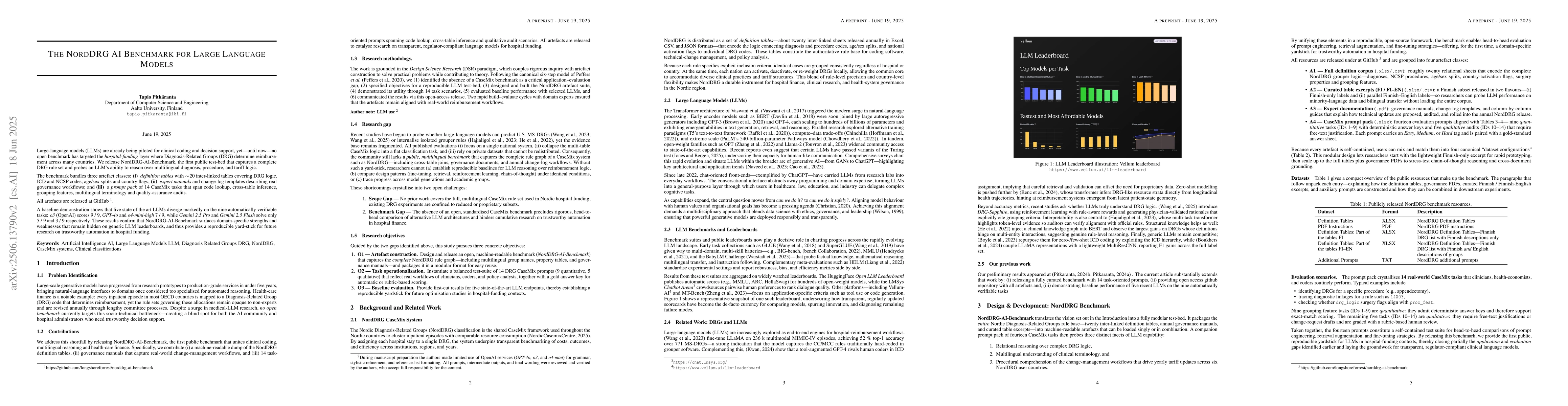 Large language models (LLMs) are already being piloted for clinical coding and decision support. However, until now, no open benchmark has targeted the hospital funding layer where Diagnosis-Related Groups (DRG) determine reimbursement across many countries. We release NordDRG-AI-Benchmark, the first public test-bed that captures a complete DRG rule set and evaluates an LLM's ability to reason over multilingual diagnosis, procedure, and tariff logic. The benchmark bundles three classes of artefacts: (i) definition tables with 20 interlinked tables covering DRG logic, ICD and NCSP codes, age/sex splits, and country flags; (ii) expert manuals and changelog templates describing real governance workflows; and (iii) a prompt pack of 14 CaseMix tasks that span code lookup, cross-table inference, multilingual terminology, and quality-assurance audits. All artefacts are available at: https://github.com/longshoreforrest/norddrg-ai-benchmark A baseline demonstration shows that five state-of-the-art LLMs perform very differently on the nine automatically verifiable tasks: o3 (OpenAI) scores 9 out of 9, GPT-4o and o4-mini-high score 7 out of 9, while Gemini 2.5 Pro and Gemini 2.5 Flash solve only 5 out of 9 and 3 out of 9, respectively. These results confirm that NordDRG-AI-Benchmark highlights domain-specific strengths and weaknesses that remain hidden in generic LLM benchmarks, offering a reproducible baseline for research on trustworthy automation in hospital funding.