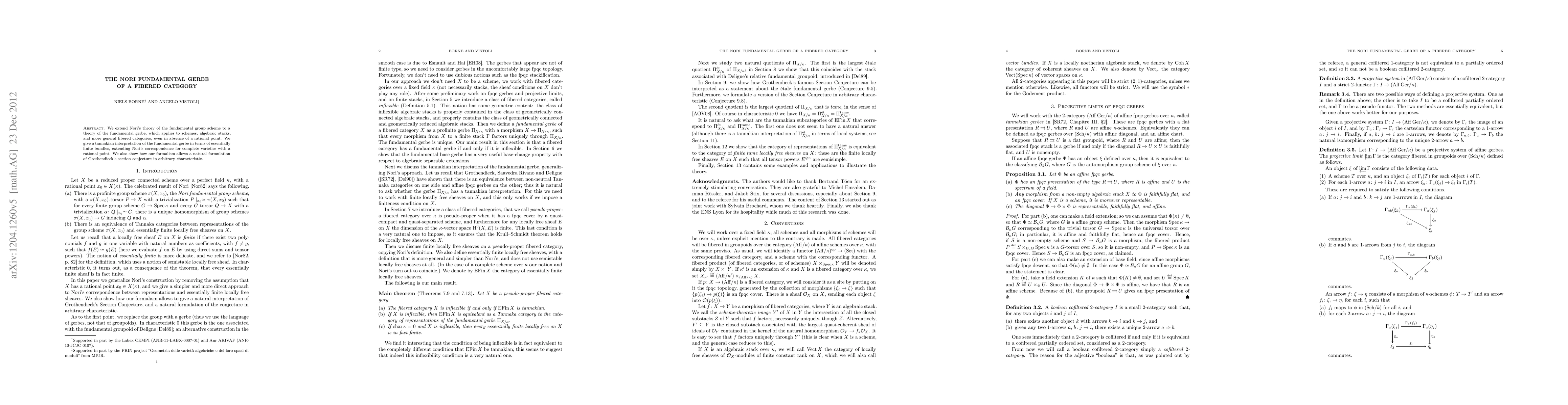 Summary: This paper presents a condition for a fibered category over a field to have a universal morphism to a profinite gerbe, generalizing Nori's and Deligne's fundamental objects, and introduces a tannakian construction using essentially finite bundles. It applies the fundamental gerbe to formulate Grothendieck's section conjecture in any characteristic, and examines natural quotients of this gerbe.