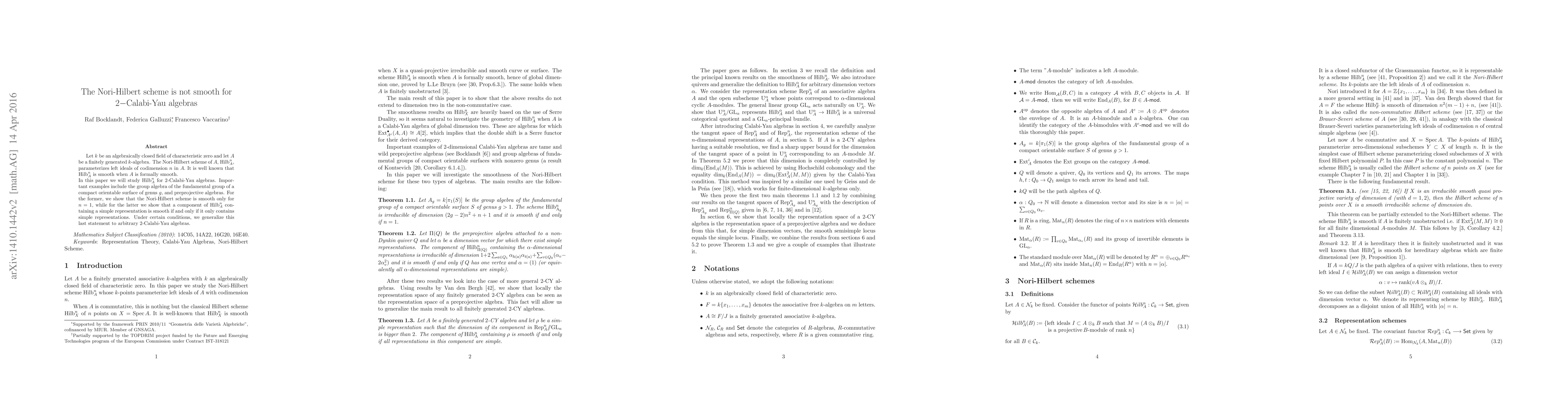 Let $k$ be an algebraically closed field of characteristic zero and let $A$ be a finitely generated $k-$algebra. The Nori - Hilbert scheme of $A$, parameterizes left ideals of codimension $n$ in $A,$ and it is well known to be smooth when $A$ is formally smooth. In this paper we will study the Nori - Hilbert scheme for $2-$Calabi Yau algebras. The main examples of these are surface group algebras and preprojective algebras. For the former we show that the Nori-Hilbert scheme is smooth for $n=1$ only, while for the latter we show that the smooth components that contain simple representations are precisely those that only contain simple representation. Under certain conditions we can generalize this last statement to arbitrary $2-$Calabi Yau algebras.