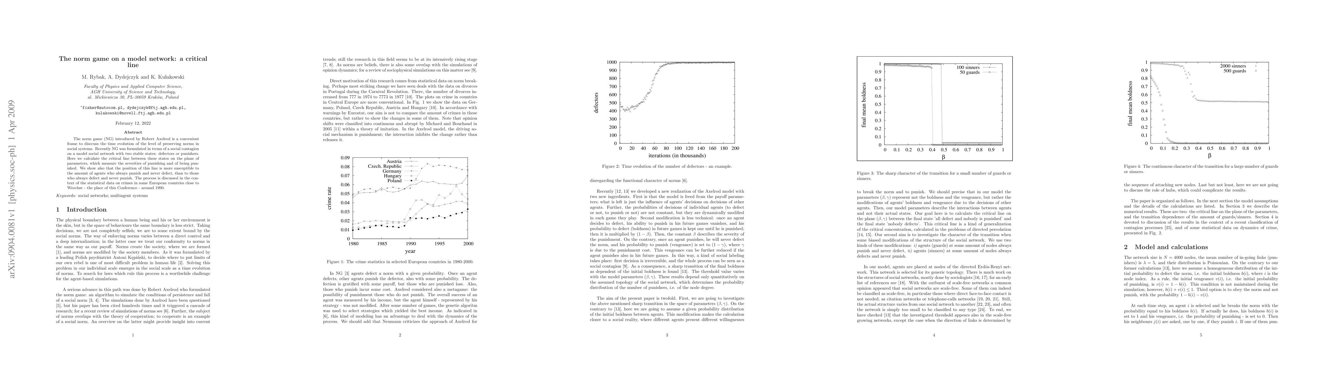 The norm game (NG) introduced by Robert Axelrod is a convenient frame to disccuss the time evolution of the level of preserving norms in social systems. Recently NG was formulated in terms of a social contagion on a model social network with two stable states: defectors or punishers. Here we calculate the critical line between these states on the plane of parameters, which measure the severities of punishing and of being punished. We show also that the position of this line is more susceptible to the amount of agents who always punish and never defect, than to those who always defect and never punish. The process is discussed in the context of the statistical data on crimes in some European countries close to Wroc{\l}aw - the place of this Conference - around 1990.