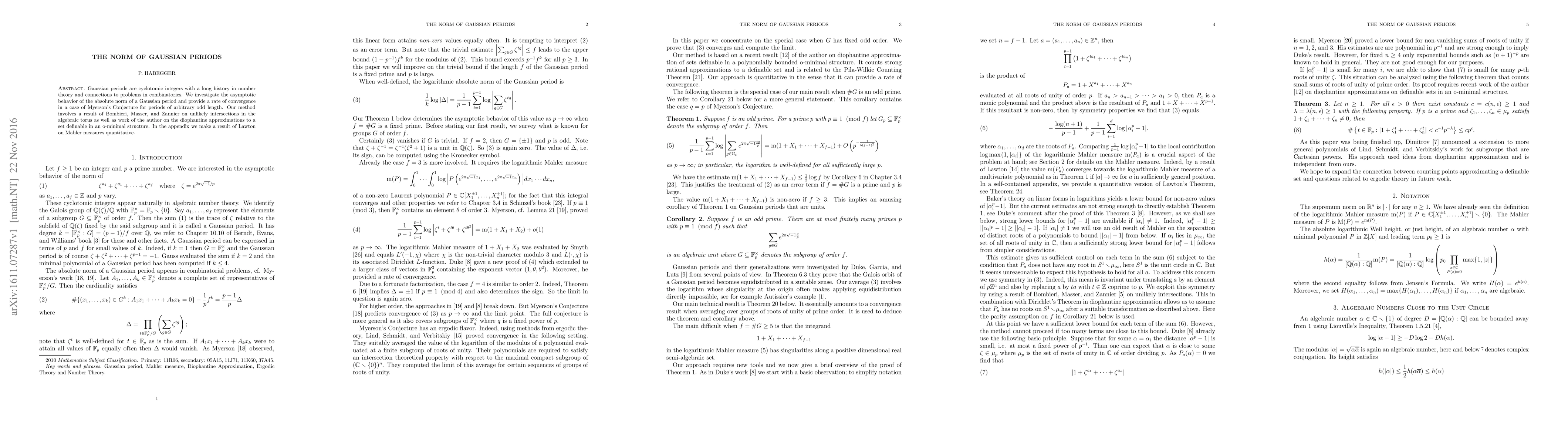 Gaussian periods are cyclotomic integers with a long history in number theory and connections to problems in combinatorics. We investigate the asymptotic behavior of the absolute norm of a Gaussian period and provide a rate of convergence in a case of Myerson's Conjecture for periods of arbitrary odd length. Our method involves a result of Bombieri, Masser, and Zannier on unlikely intersections in the algebraic torus as well as work of the author on the diophantine approximations to a set definable in an o-minimal structure. In the appendix we make a result of Lawton on Mahler measures quantitative.