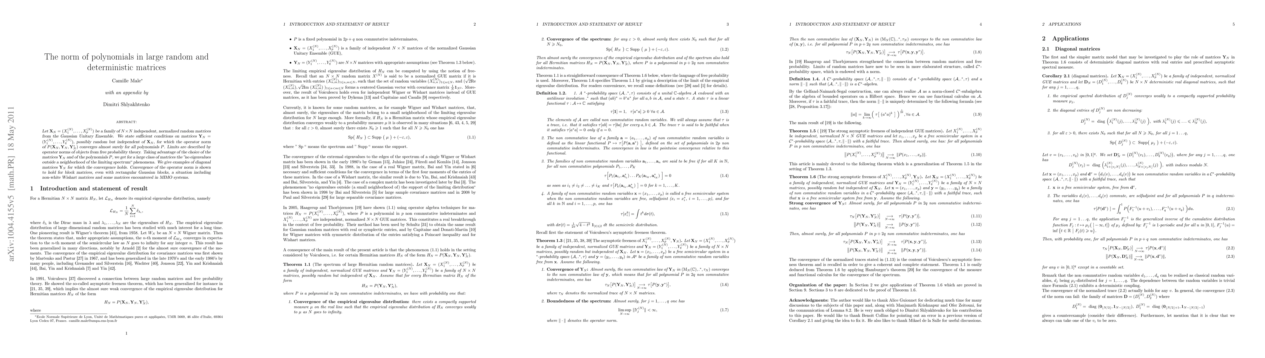 This paper investigates the convergence of the operator norm of polynomials in large random matrices from the Gaussian Unitary Ensemble and independent deterministic matrices. It establishes sufficient conditions for the convergence almost surely, linking it to limits described by free probability theory, and demonstrates the "no eigenvalues outside a neighborhood of the limiting spectrum" phenomenon for various matrix types, including block and non-white Wishart matrices.