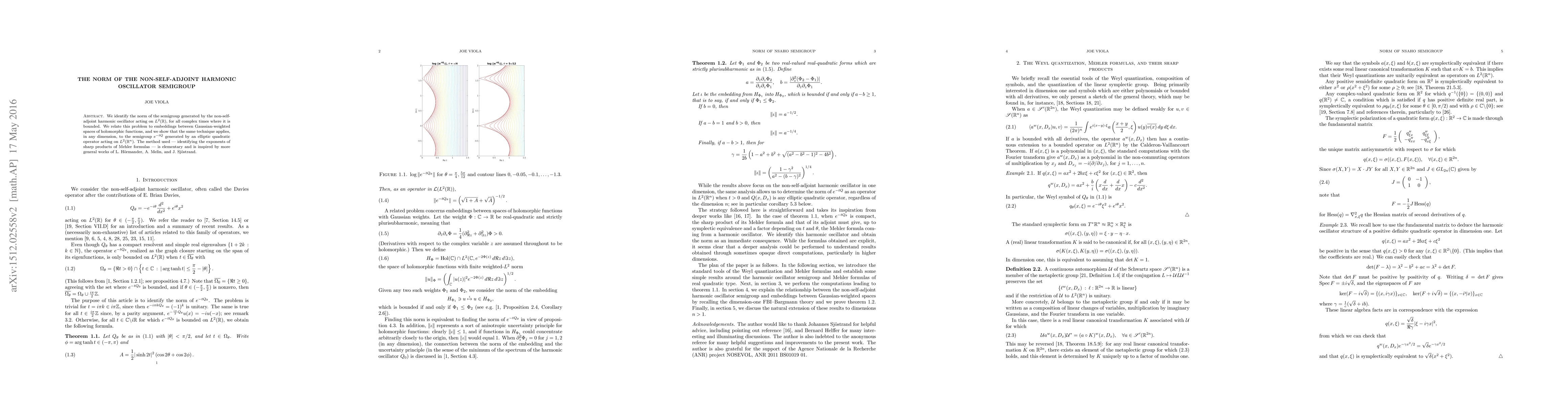This paper determines the norm of the non-self-adjoint harmonic oscillator semigroup for all complex times, relating it to embeddings between Gaussian-weighted spaces of holomorphic functions. The method, inspired by works of Hörmander et al., also extends to higher-dimensional elliptic quadratic operators.
