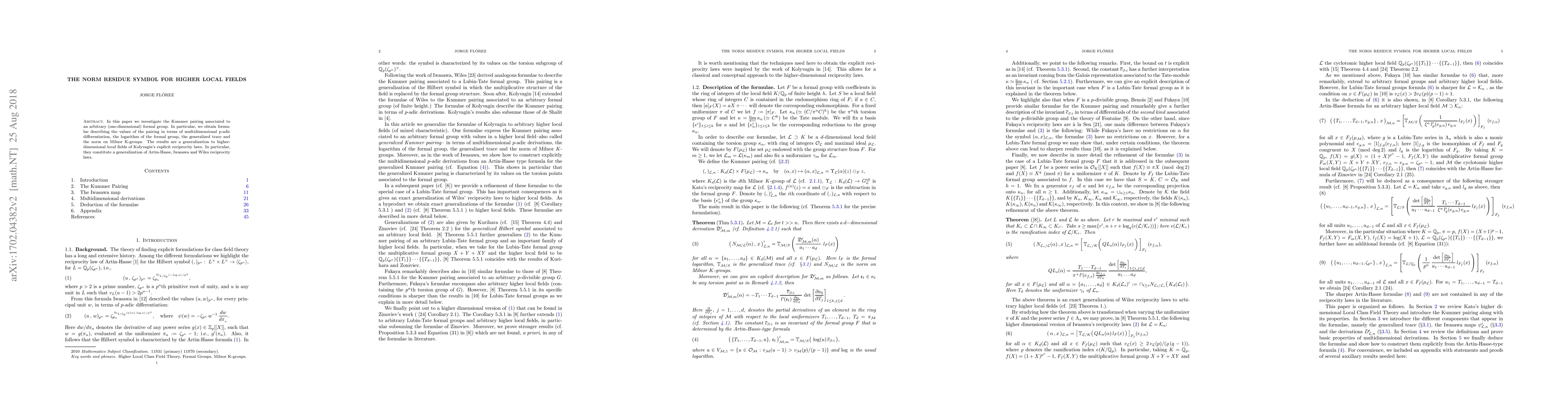 This paper constructs an explicit reciprocity law for the Kummer pairing associated with any one-dimensional formal group, generalizing Kolyvagin's reciprocity laws to higher-dimensional local fields. The results are applied to derive explicit formulas for the generalized Hilbert symbol and the Kummer pairing associated with Lubin-Tate formal groups.