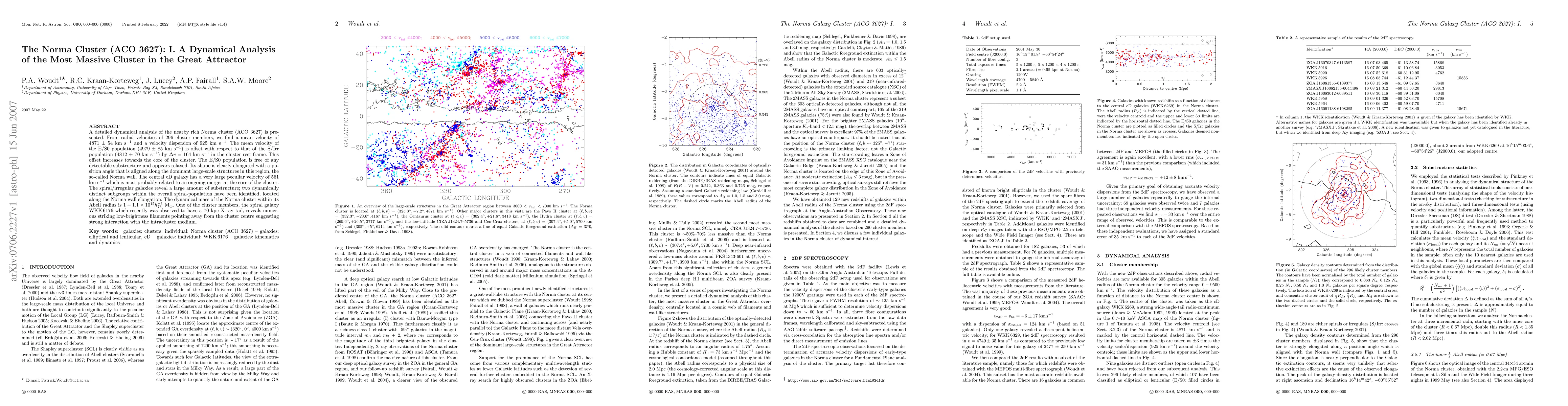 A detailed dynamical analysis of the nearby rich Norma cluster (ACO 3627) is presented. From radial velocities of 296 cluster members, we find a mean velocity of 4871 +/- 54 km/s and a velocity dispersion of 925 km/s. The mean velocity of the E/S0 population (4979 +/- 85 km/s) is offset with respect to that of the S/Irr population (4812 +/- 70 km/s) by `Delta' v = 164 km/s in the cluster rest frame. This offset increases towards the core of the cluster. The E/S0 population is free of any detectable substructure and appears relaxed. Its shape is clearly elongated with a position angle that is aligned along the dominant large-scale structures in this region, the so-called Norma wall. The central cD galaxy has a very large peculiar velocity of 561 km/s which is most probably related to an ongoing merger at the core of the cluster. The spiral/irregular galaxies reveal a large amount of substructure; two dynamically distinct subgroups within the overall spiral-population have been identified, located along the Norma wall elongation. The dynamical mass of the Norma cluster within its Abell radius is 1 - 1.1 x 10^15 h^-1_73 M_Sun. One of the cluster members, the spiral galaxy WKK 6176 which recently was observed to have a 70 kpc X-ray tail, reveals numerous striking low-brightness filaments pointing away from the cluster centre suggesting strong interaction with the intracluster medium.