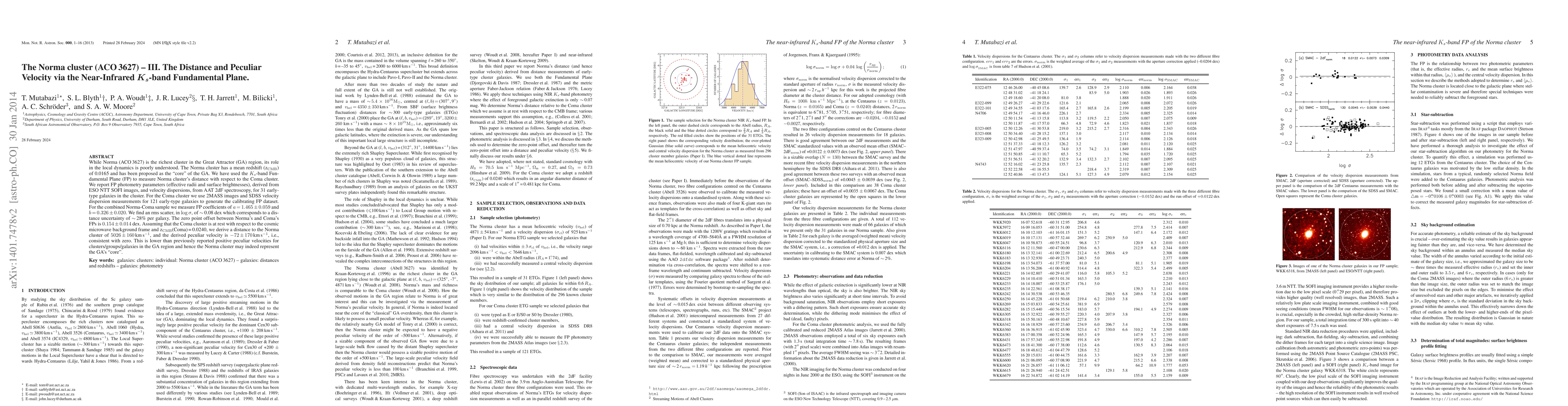 The Norma cluster's distance is determined using the Ks-band Fundamental Plane, with an estimated distance of 5026±160 km/s, suggesting a peculiar velocity of -72±170 km/s, indicating it may serve as the "core" of the Great Attractor region.