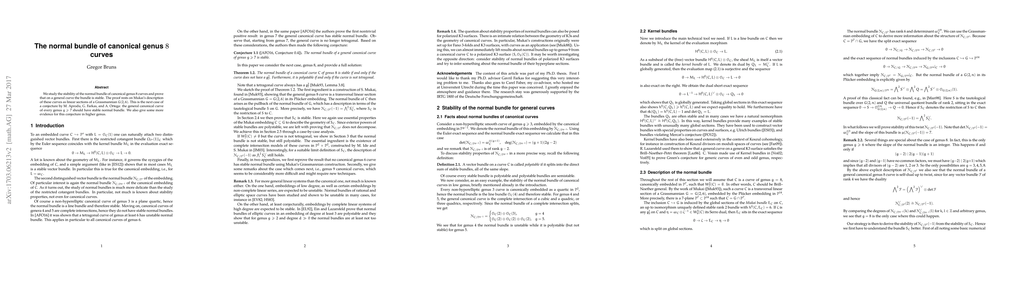 We study the stability of the normal bundle of canonical genus $8$ curves and prove that on a general curve the bundle is stable. The proof rests on Mukai's description of these curves as linear sections of a Grassmannian $\mathrm{G}(2,6)$. This is the next case of a conjecture by M. Aprodu, G. Farkas, and A. Ortega: the general canonical curve of every genus $g \geq 7$ should have stable normal bundle. We also give some more evidence for this conjecture in higher genus.
