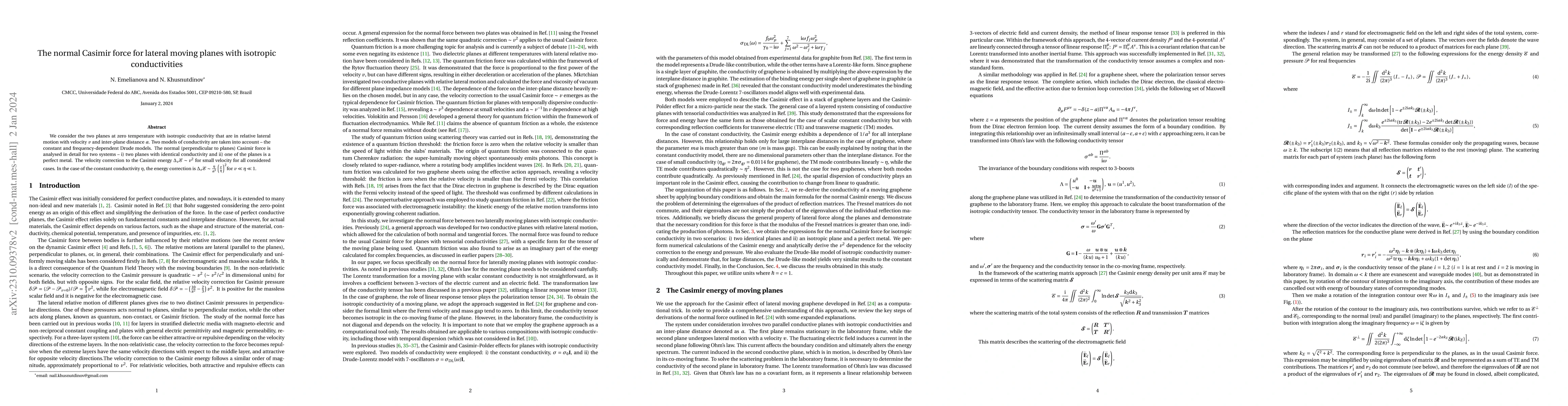 This paper analyzes the normal Casimir force between two laterally moving planes with isotropic conductivity at zero temperature, comparing constant and frequency-dependent Drude models. It finds a velocity correction to the Casimir energy proportional to $v^2$ for small velocities, with specific expressions for systems of identical and metal-nonmetal conductivities.