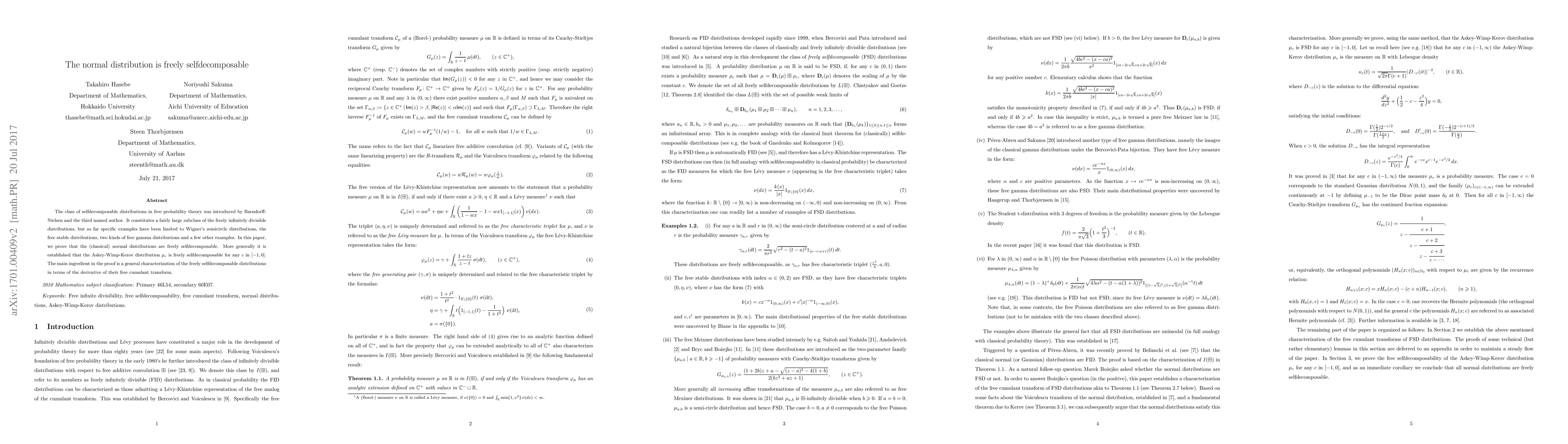 The class of selfdecomposable distributions in free probability theory was introduced by Barndorff-Nielsen and the third named author. It constitutes a fairly large subclass of the freely infinitely divisible distributions, but so far specific examples have been limited to Wigner's semicircle distributions, the free stable distributions, two kinds of free gamma distributions and a few other examples. In this paper, we prove that the (classical) normal distributions are freely selfdecomposable. More generally it is established that the Askey-Wimp-Kerov distribution $\mu_c$ is freely selfdecomposable for any $c$ in $[-1,0]$. The main ingredient in the proof is a general characterization of the freely selfdecomposable distributions in terms of the derivative of their free cumulant transform.